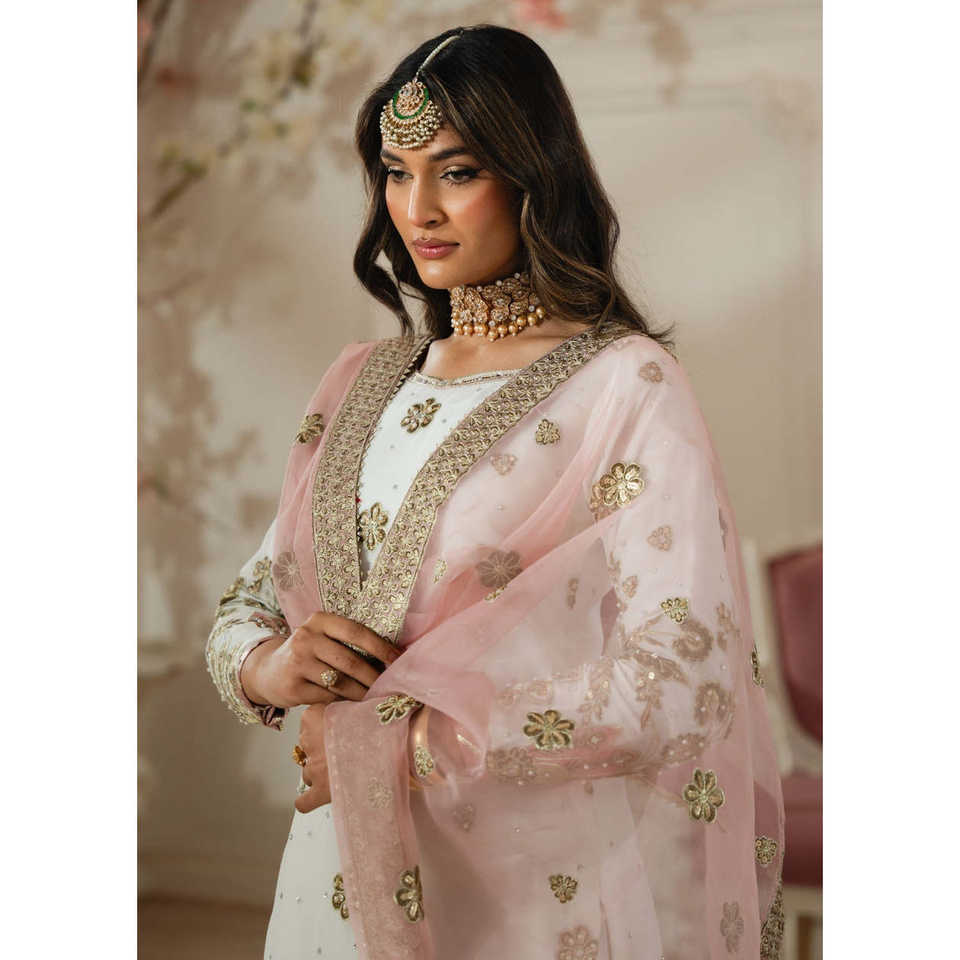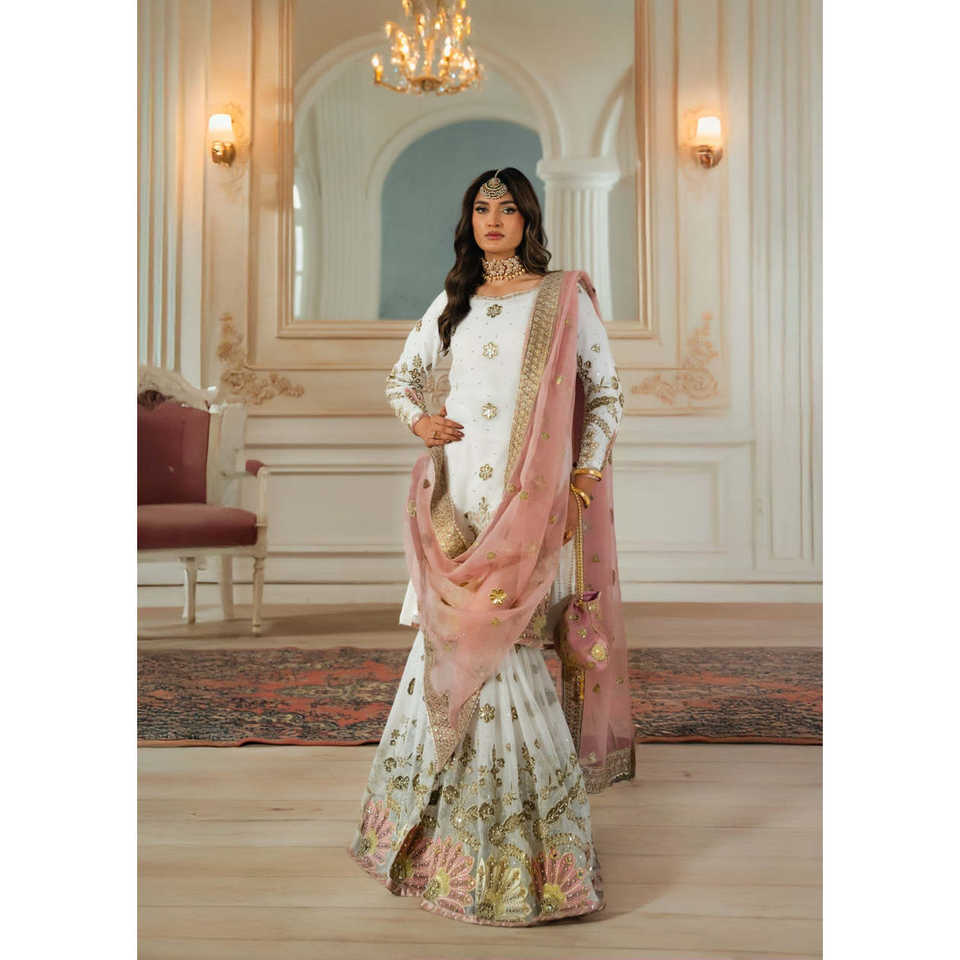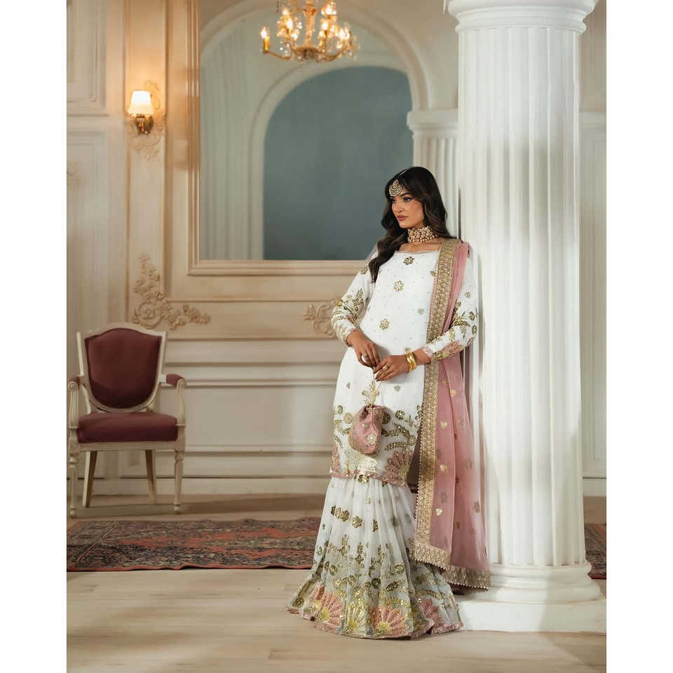 ชุดเสื้อปาร์ตี้สีขาวของ NSR ดีไซเนอร์สำหรับผู้หญิงชุดท็อปพลาสโซและชุดดูแมทธ์ปักลายขนาดใหญ่ดูสง่างาม