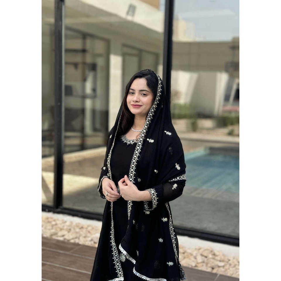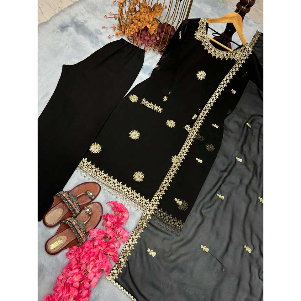 ชุดเสื้อและผ้าคลุมไหล่สีดำสำหรับงานปาร์ตี้ของผู้หญิง ดีไซน์เนอร์ PD-Aarohi พร้อมกางเกงพลัสโซ่สุดหรูและงานปักประณีต ขนาด M