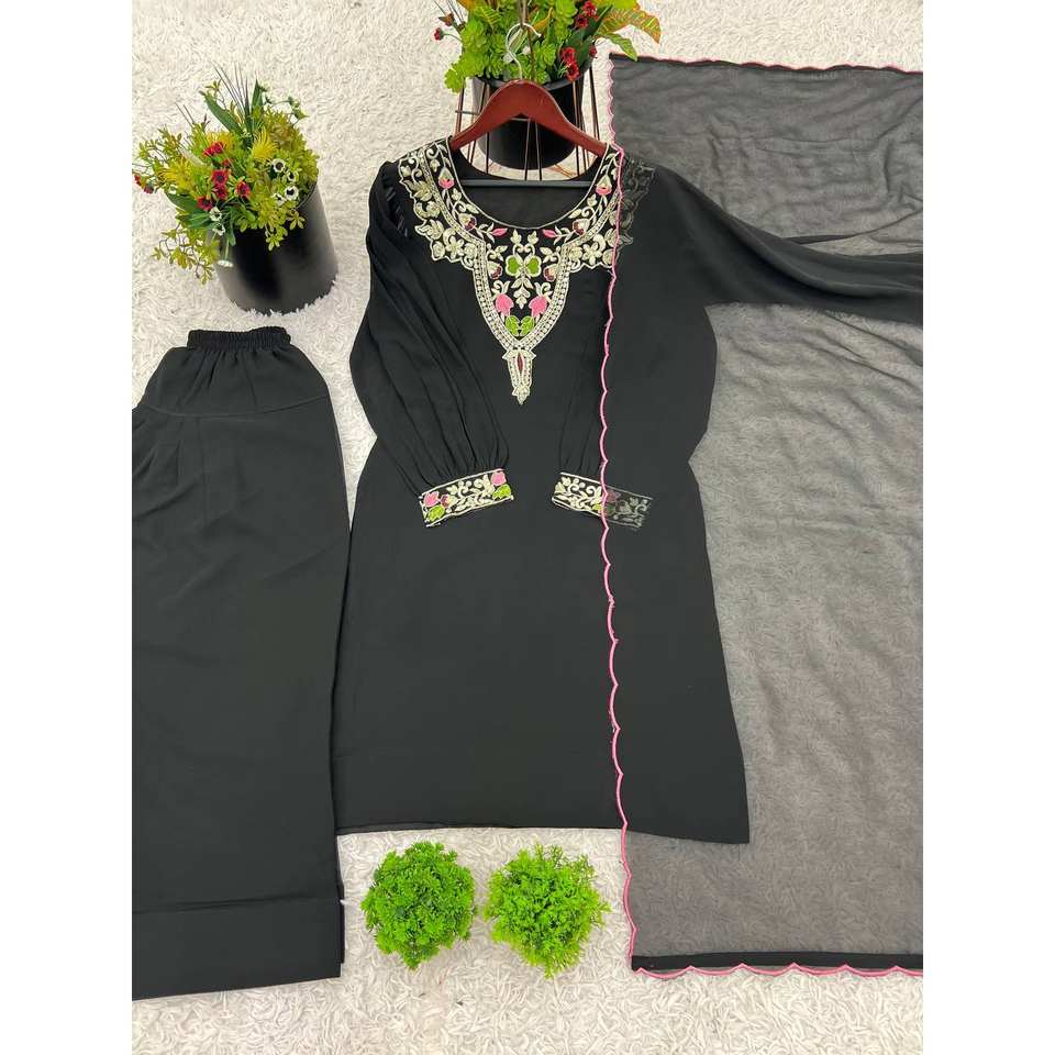 ชุดออกงานสำหรับผู้หญิง ดีไซน์เนอร์ ท็อป-พลลาซโซ และผ้าคลุมไหล่ งานปักหนัก