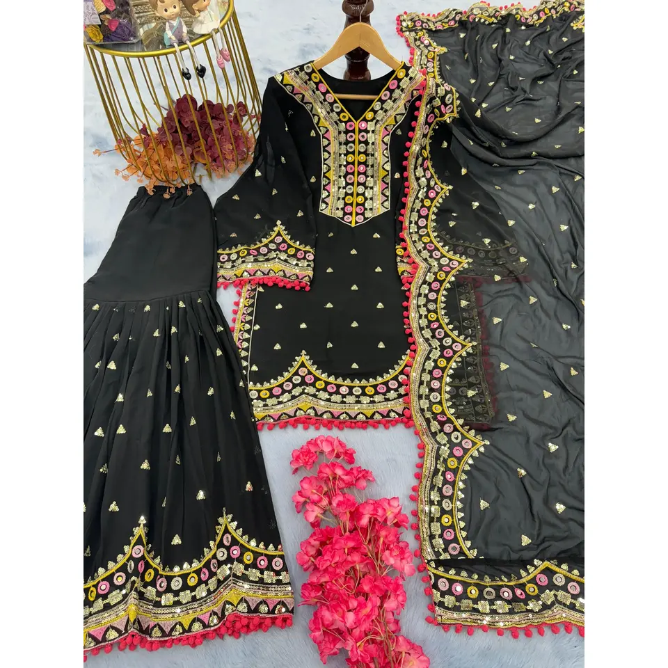 ชุดเสื้อและกางเกงปาลาซโซสำหรับผู้หญิง ดีไซน์เนอร์ พร้อมผ้าคลุมไหล่ปักลายแฟนซี