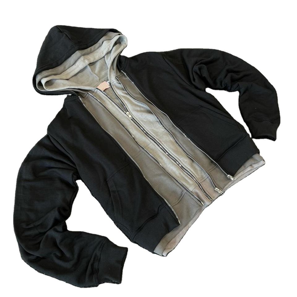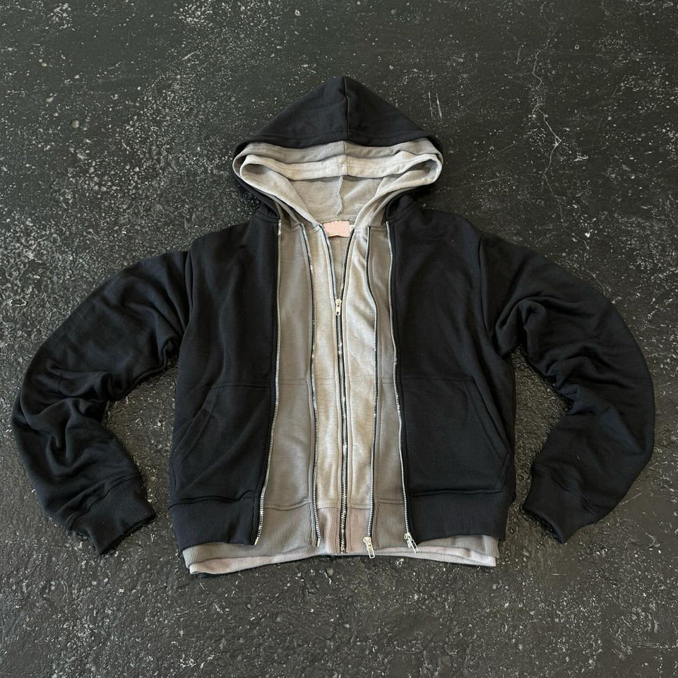 เสื้อฮู้ดสำหรับผู้ชายแนวสตรีทสีพื้นมีซิป Y2K ดีไซน์เนอร์สามชั้นแบบปรับแต่งได้