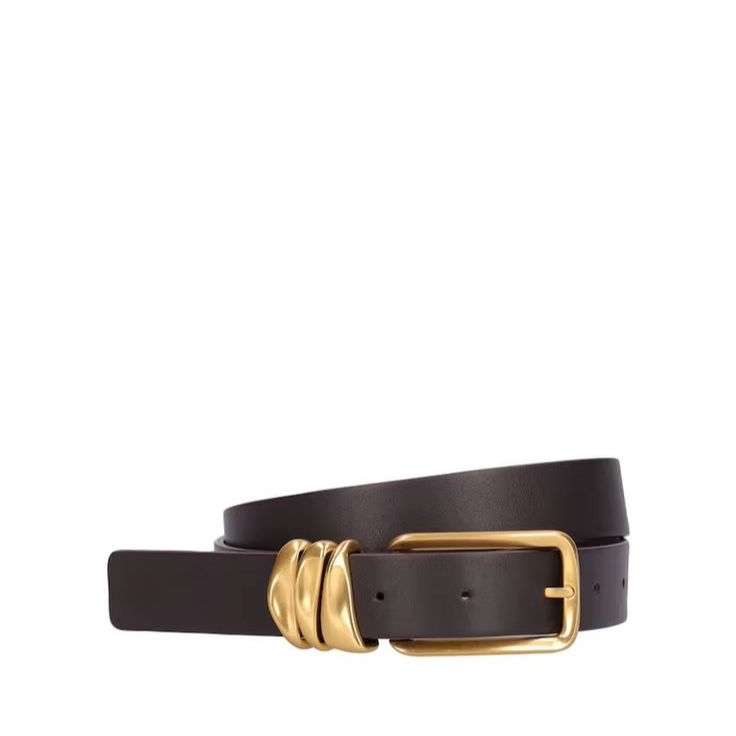 เข็มขัดหนังแท้ที่มีตราสินค้าพร้อมหัวเข็มขัดเหล็กขัดเงาเหมาะสำหรับลุคมืออาชีพและชุดลำลองอัจฉริยะ