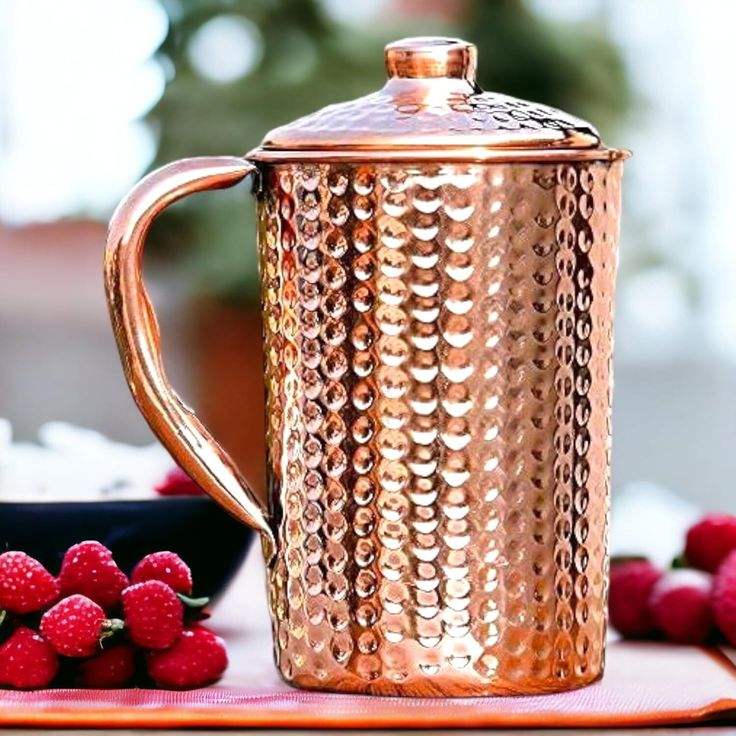 เหยือกทองแดงดีไซเนอร์ที่สร้างขึ้นโดยช่างฝีมือชาวอินเดียนนำเสนอความทนทานของพื้นผิวที่สมบูรณ์แบบสำหรับผู้ที่ชื่นชอบสุขภาพห้องครัว