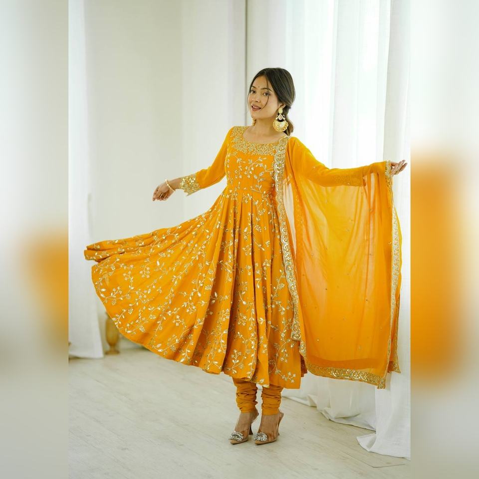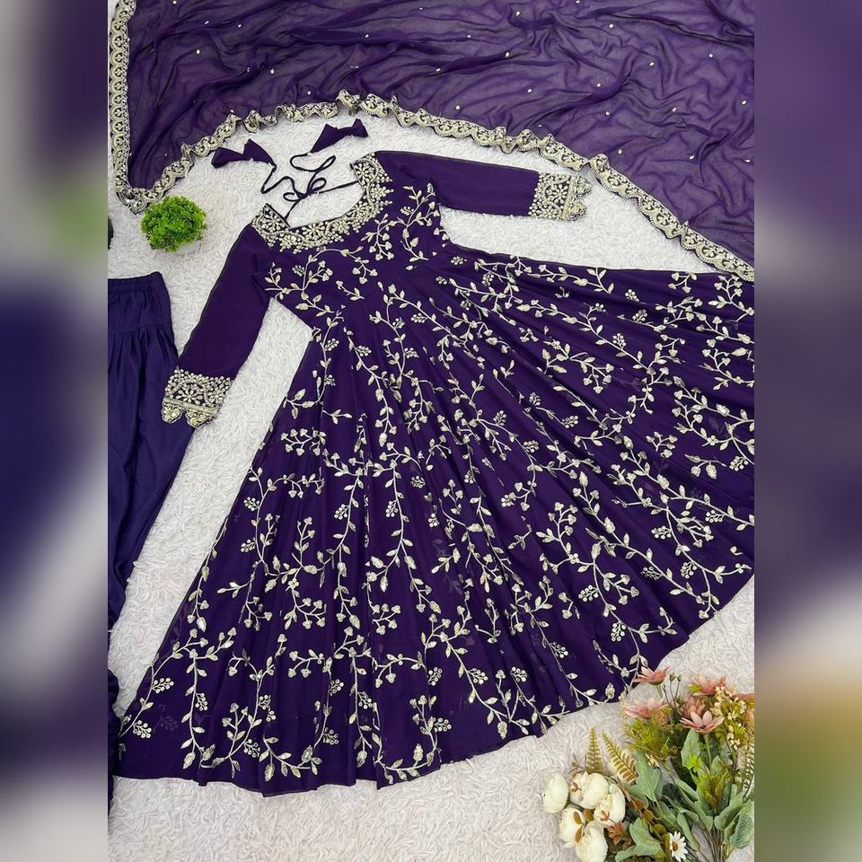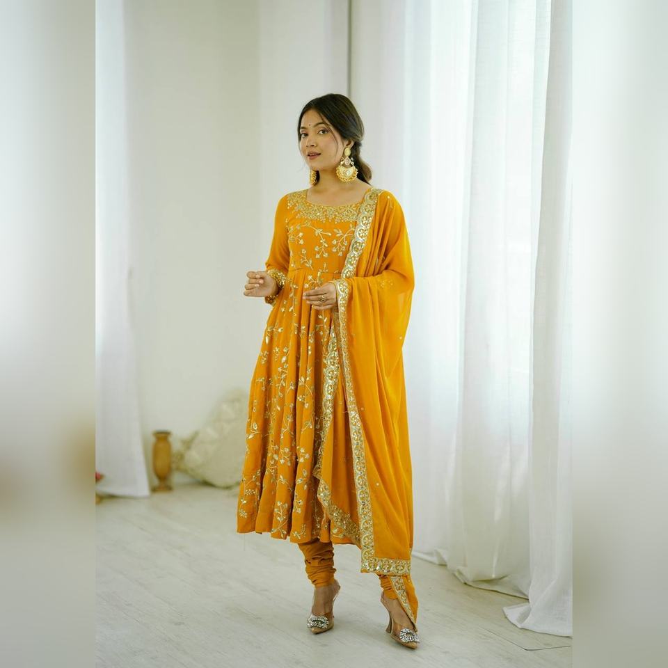 ชุดเดรสอนาร์กาลีผ้าจอร์เจตต์ลายปักเลื่อมพร้อมกางเกงชูริดาร์และผ้าคลุมไหล่ลูกไม้สำหรับงานพิธีกรรมแบบดั้งเดิมระดับพรีเมียม