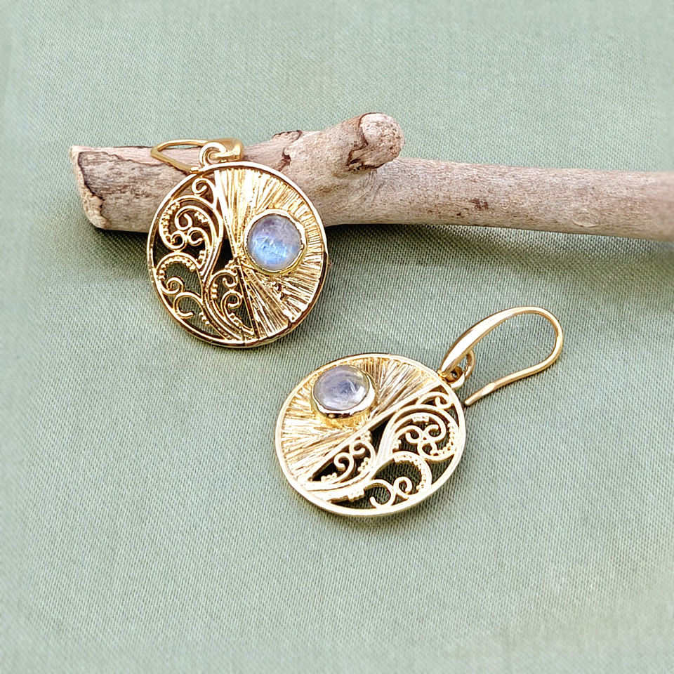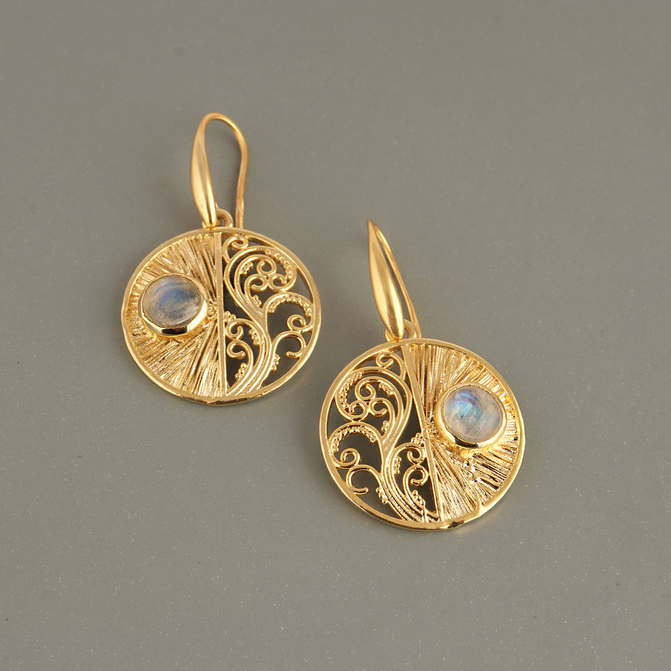 ต่างหูแบบห้อยสไตล์ดีไซเนอร์ ประดับด้วยมูนสโตนทรงกลมแบบคาโบชอง ดีไซน์ลายฉลุ ตัวเกี่ยวแบบตะขอ ชุบทอง 18k ขายส่งเครื่องประดับ