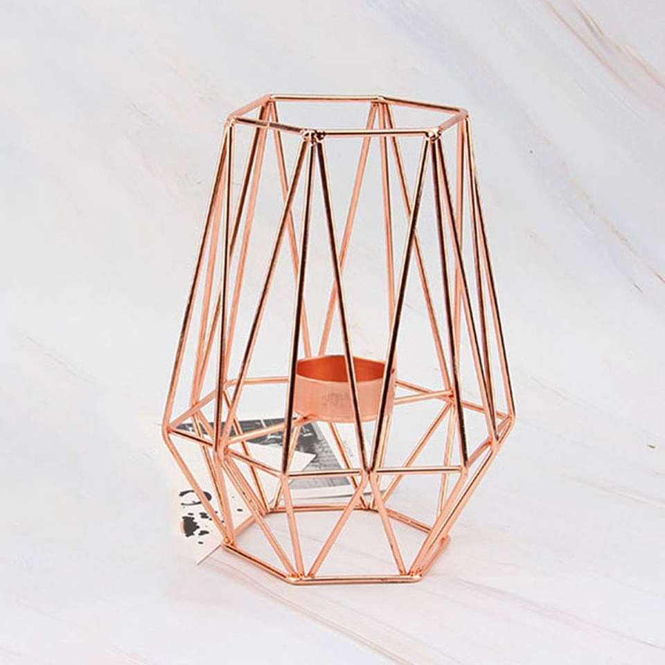 ที่วางเทียนรูปทรงเรขาคณิต 3 มิติ ดีไซน์เนอร์บ็อกซ์ ทำจากลวดเหล็กชุบทองแดงสีโรสโกลด์ งานแฮนด์เมด ดีไซน์สวยหรู ตกแต่งบ้าน