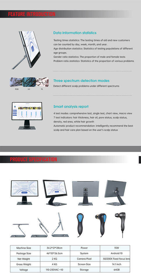 เครื่องสแกนตรวจจับผมร่วงแบบตั้งโต๊ะ3D พร้อมหน้าจอแบบปรับได้ช่วยตรวจจับความละเอียดสูงในการจัดเก็บข้อมูลบนระบบคลาวด์