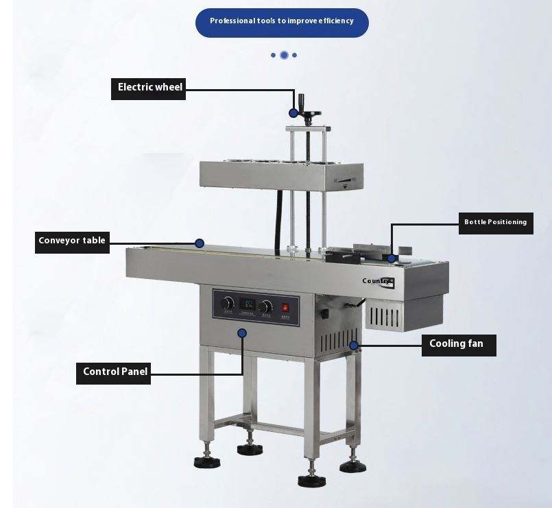 เครื่องปิดฝาขวดแบบต่อเนื่องสำหรับเดสก์ท็อป ใช้ฟอยล์อะลูมิเนียม ระบบทำความร้อนด้วยลมเย็น พร้อมระบบปิดผนึกด้วยแม่เหล็กไฟฟ้า
