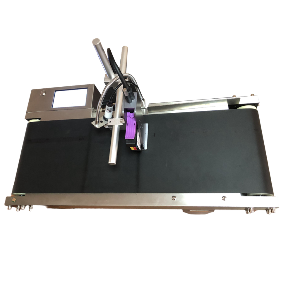 สายพานลำเลียงแบบตั้งโต๊ะพร้อมเครื่องพิมพ์อิงค์เจ็ทสำหรับขวดกล่องกระดาษพิมพ์วันที่