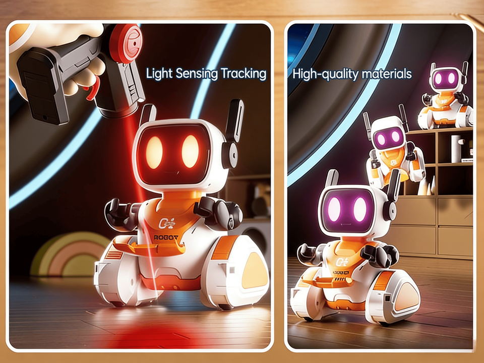 หุ่นยนต์อัจฉริยะตั้งโต๊ะ ใช้พลังงานแบตเตอรี่ ของเล่นพลาสติก มีไฟ ติดตามเสียง และถาดส่งของ