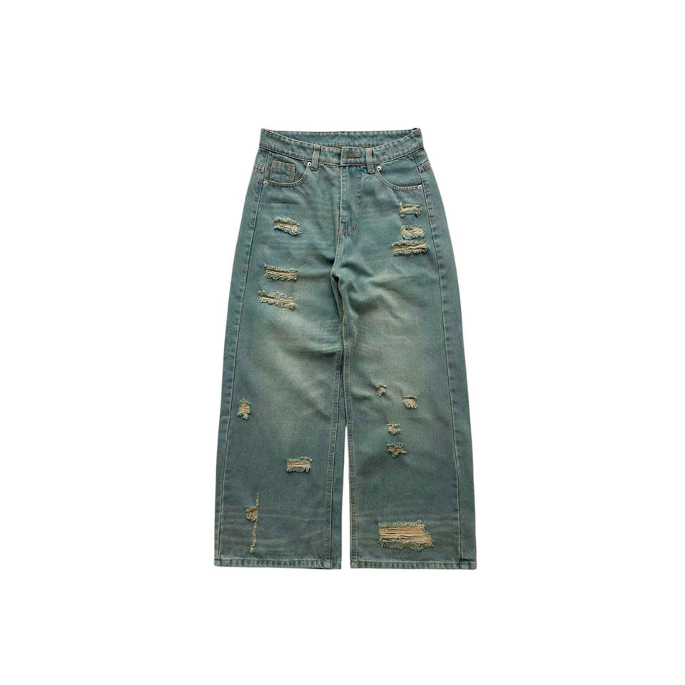 คำอธิบาย:ผ้ายีนส์ unisex, กางเกงยีนส์ถุง, ผ้าฝ้าย,, ถูกทำลายล้าง