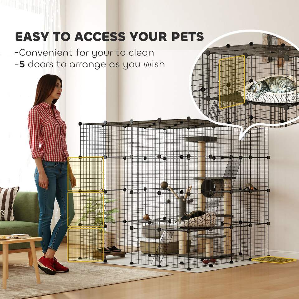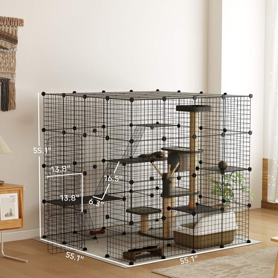 กรงแมวโลหะสีดำขนาด 55 นิ้วแบบถอดประกอบได้ พร้อมแท่นและทางลาดสำหรับแมว 1-3 ตัว กรงสัตว์เลี้ยงที่ใช้งานร่วมกับอุปกรณ์เสริมได้