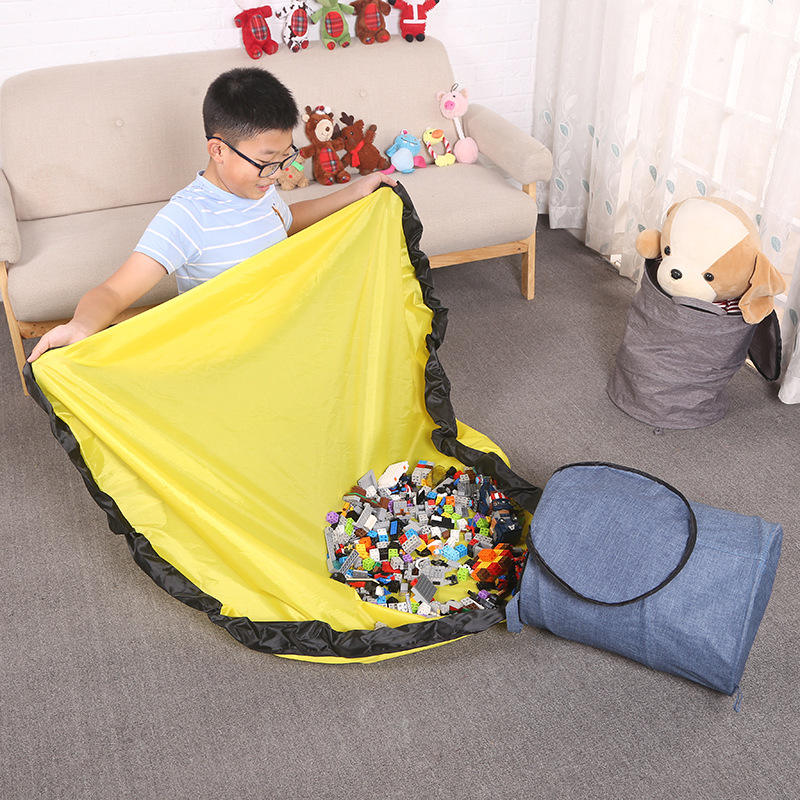 กระเป๋าเก็บของแบบถอดได้สำหรับเลโก้และของเล่นพร้อมแผ่นรองเล่น ผ้าอ็อกซ์ฟอร์ดสีน้ำเงิน ตะกร้าของเล่นสำหรับเด็กแบบยูนิเซ็กส์