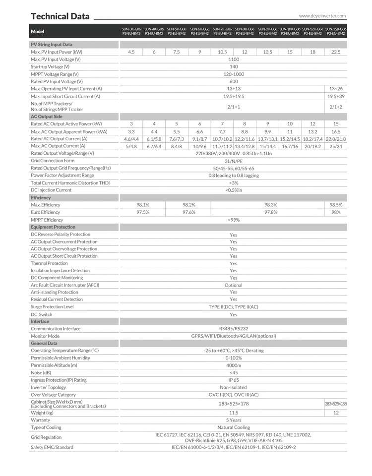 Deye Sun-3/4/5/6/7/8/9/10/12/15K-G06P3-EU-BM2อินเวอร์เตอร์กริดไทสามเฟสเอาต์พุต3-15kW 400V