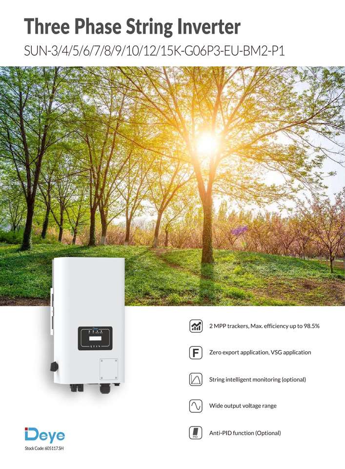 Deye Sun-3/4/5/6/7/8/9/10/12/15K-G06P3-EU-BM2-P1อินเวอร์เตอร์พลังงานแสงอาทิตย์สามเฟสเอาต์พุต400V 98.5% ประสิทธิภาพสูง