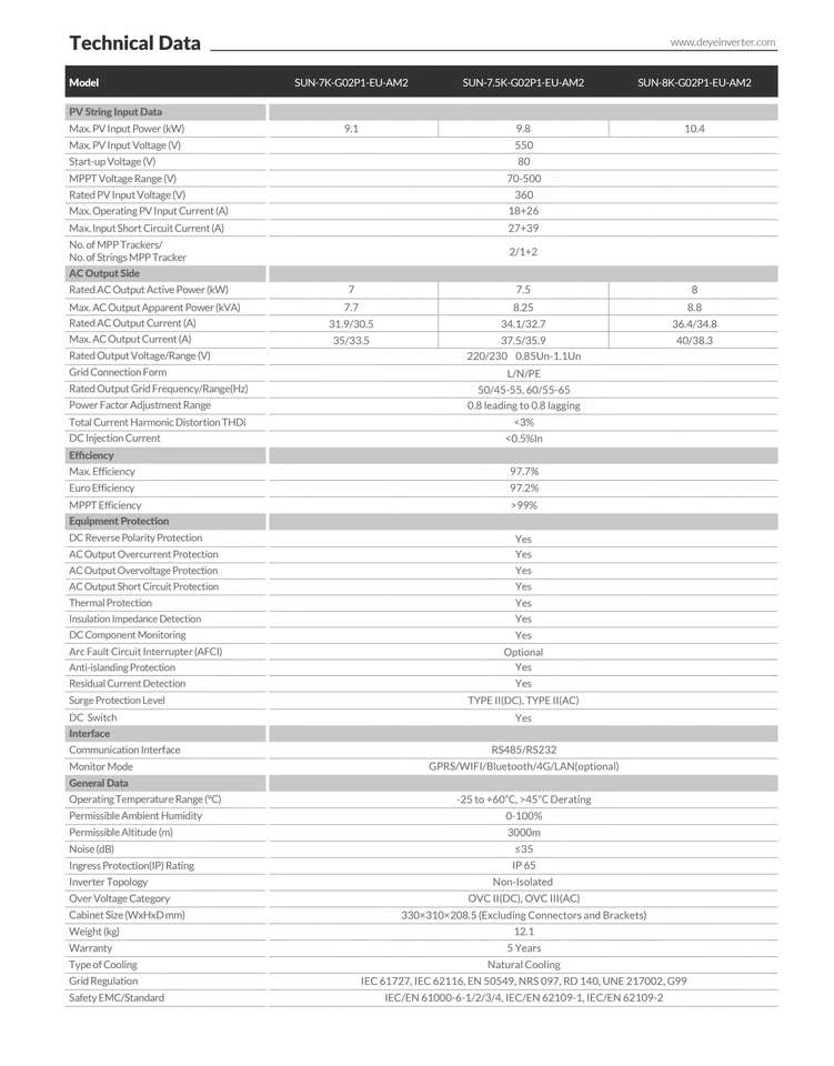 Deye SUN-7/7.5/8K-G02P1-EU-AM2 7kw 7.5kw 8kw Single Phase On Grid Solar Inverter 2 MPPT IP65 WIFI Home Use