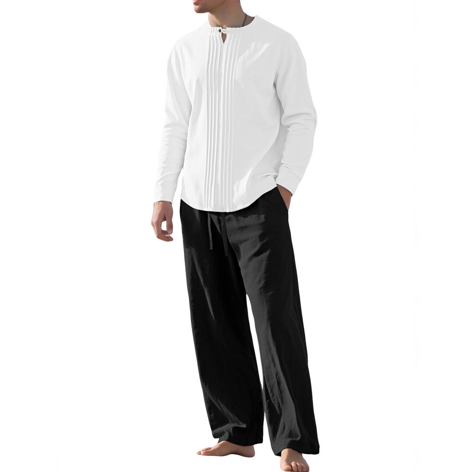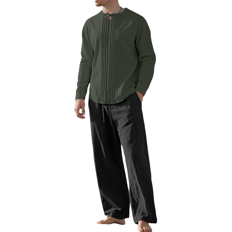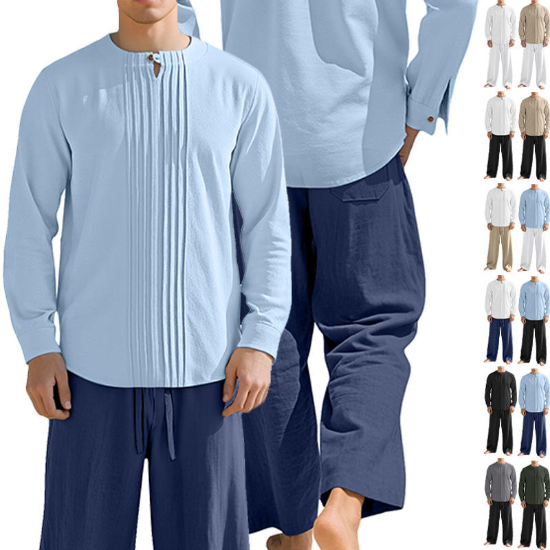 Df-165169เสื้อเชิ้ตแขนยาวคอตตอนลินินผู้ชาย, สีทึบคอตั้งลำลองสวมใส่ทุกวันฤดูใบไม้ผลิฤดูใบไม้ร่วง