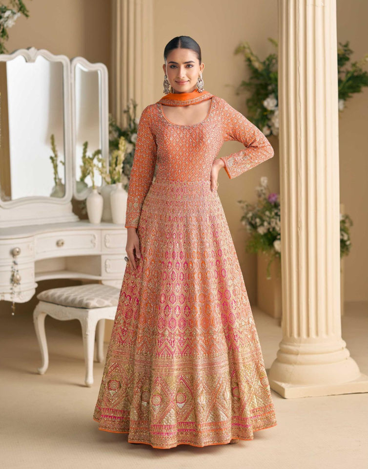 ชุดเดรสอนาร์กาลีผ้าจอร์เจตต์พรีเมียมสำหรับผู้หญิง ยี่ห้อดีวาจา เอ็กซ์พอร์ต พร้อมผ้าคลุมไหลปักลาย ทรงปกติ เหมาะสำหรับงานปาร์ตี้ งานแต่งงาน งานเฉลิมฉลอง งานพิธีต่างๆ งานปักอย่างดี