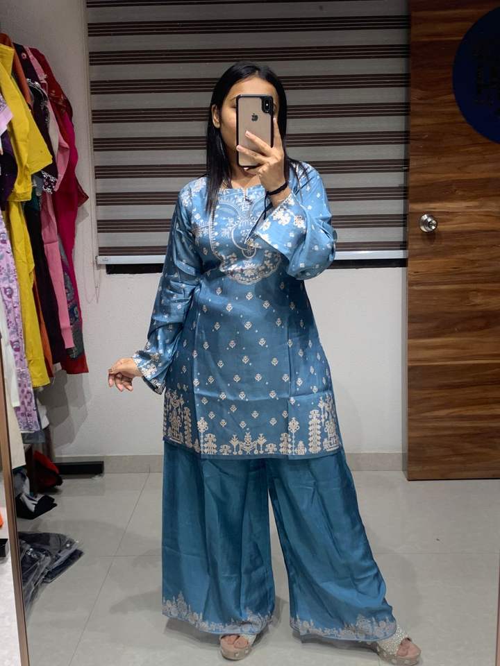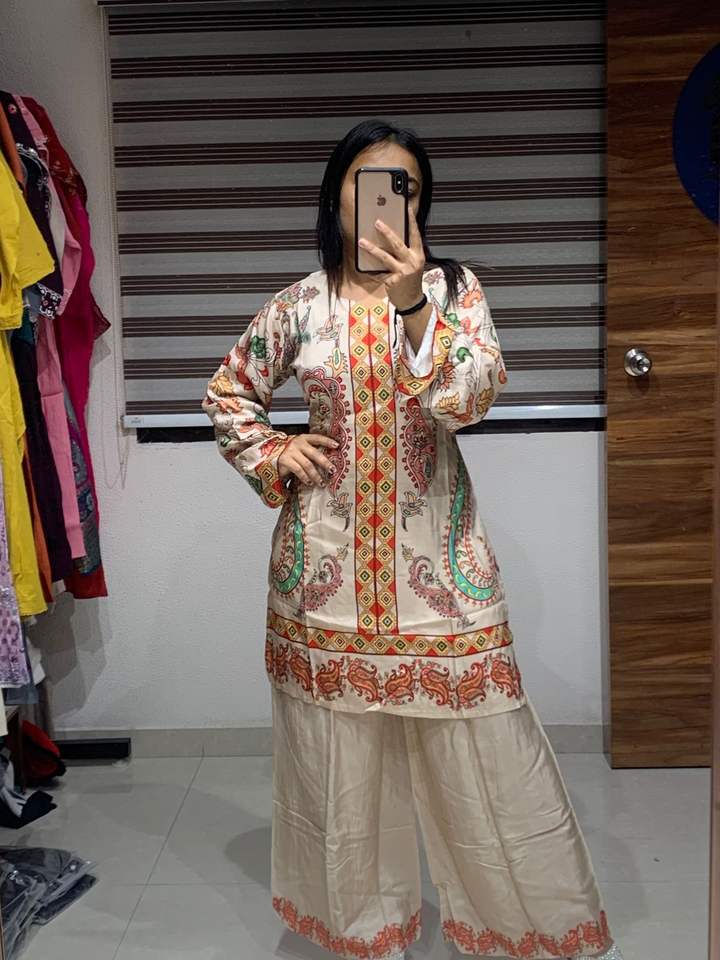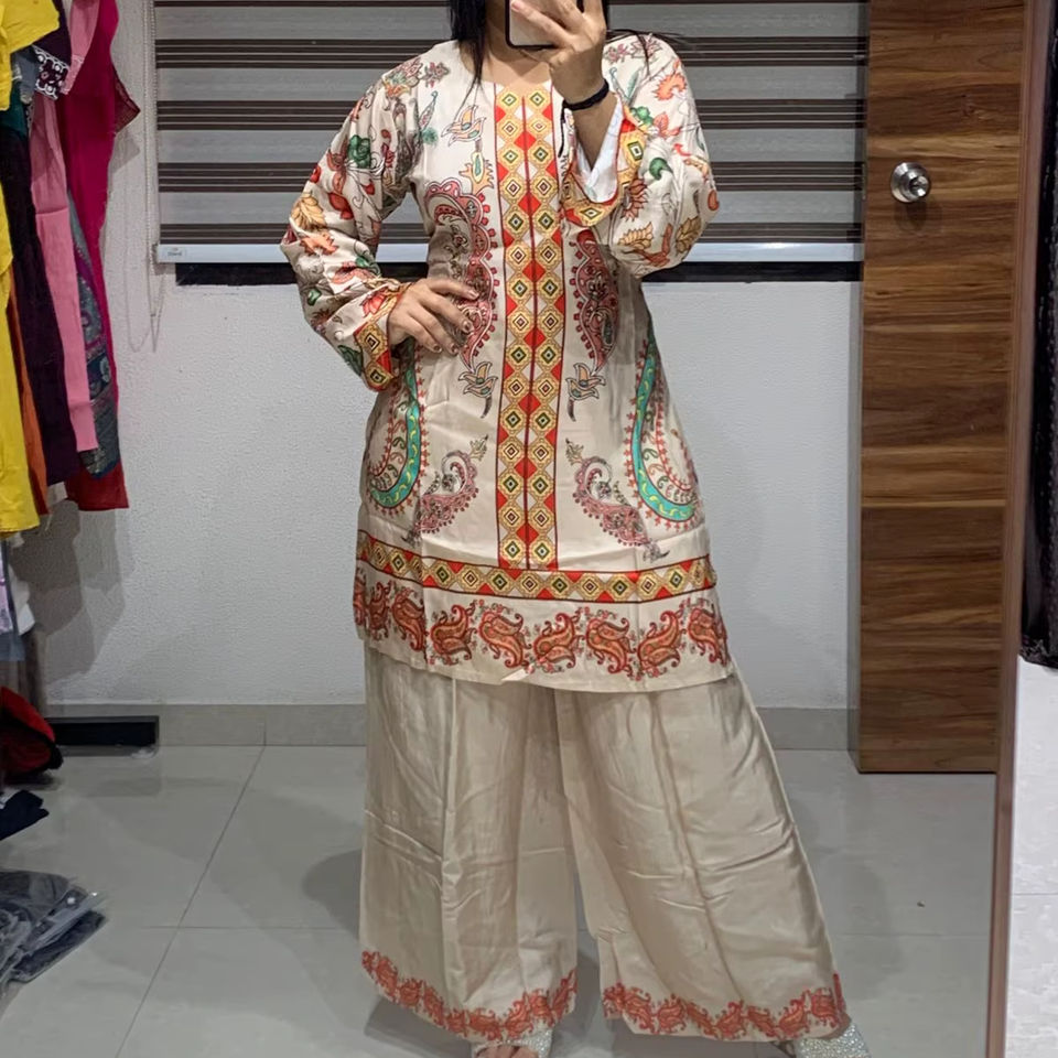 ชุดเซ็ตสไตล์ดั้งเดิมสำหรับผู้หญิง ผ้ามัสลินเครปแท้ ไซส์ L ลายพิมพ์ดิจิทัล แห้งเร็ว สไตล์ชาติพันธุ์ ยี่ห้อ Dhwaja Export