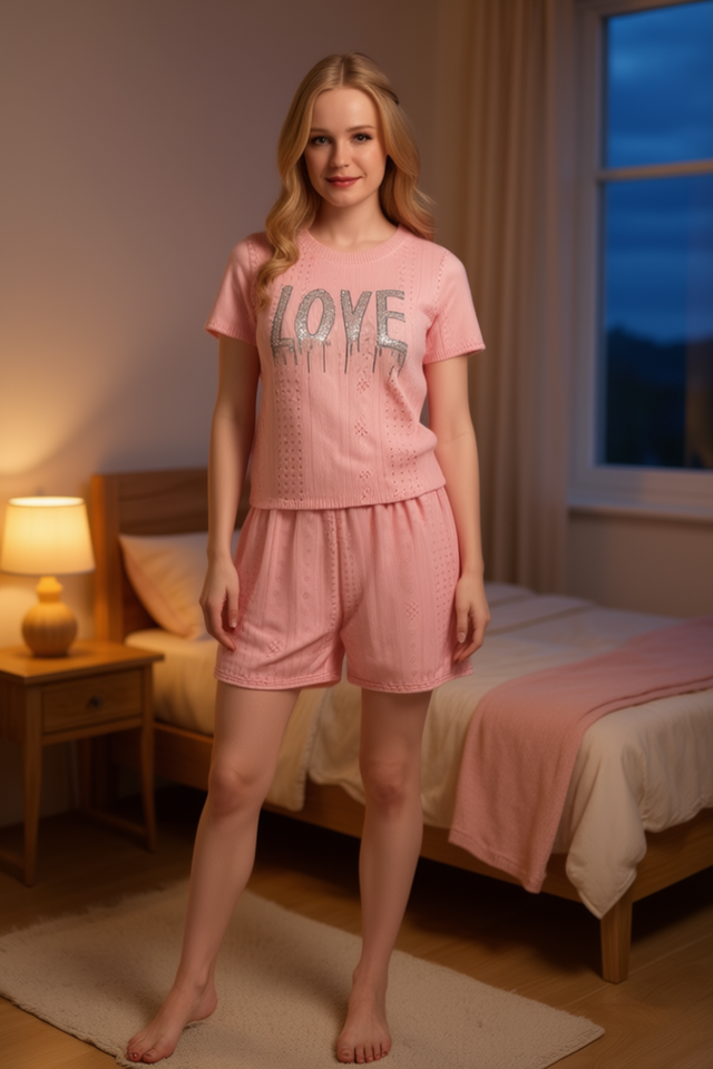 ชุดนอนผ้าถักสีชมพูสำหรับผู้หญิง แบรนด์ไดามันเต้ แขนสั้น คอกลม พิมพ์ลายกลิตเตอร์รูปหัวใจ สไตล์ลำลอง ชุดนอนฤดูร้อน 2 ชิ้น