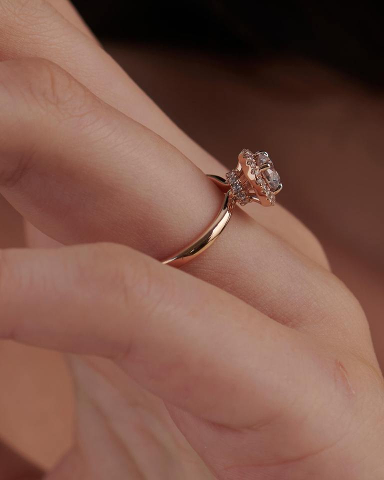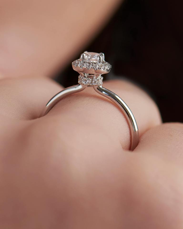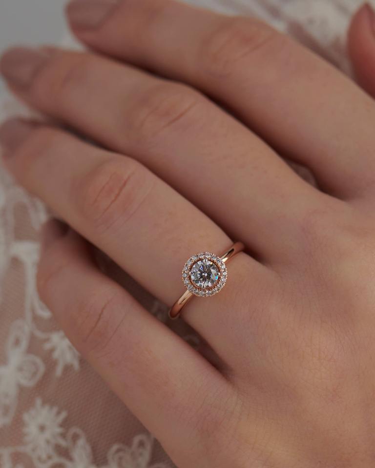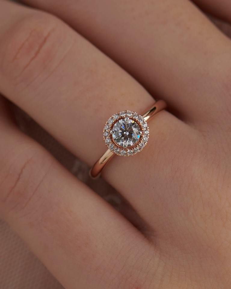 แหวนเพชรประดับรัศมีวงแหวนเพชรสีทอง18Kt พร้อมศูนย์กะรัต025กะรัตและเพชรด้านข้าง012กะรัตดีไซน์สวยหรู