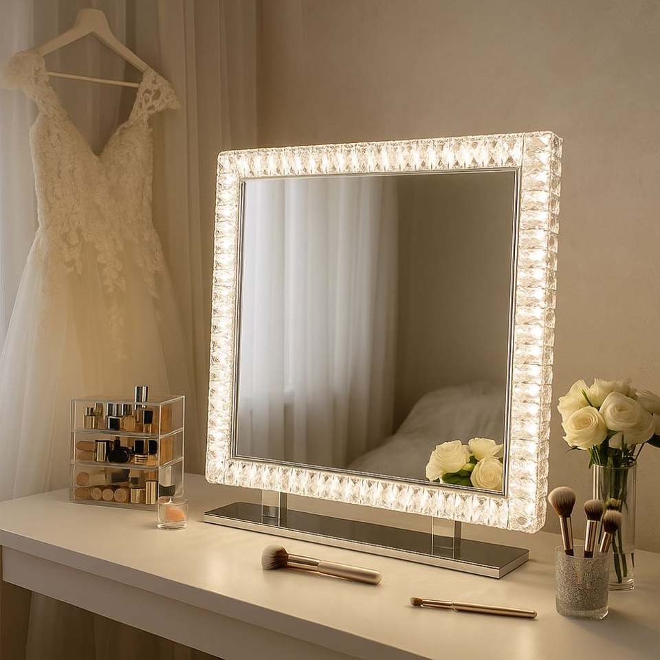 กระจกแต่งหน้าคริสตัลหรูหรา กระจกแต่งหน้าเพชร พร้อมไฟ LED