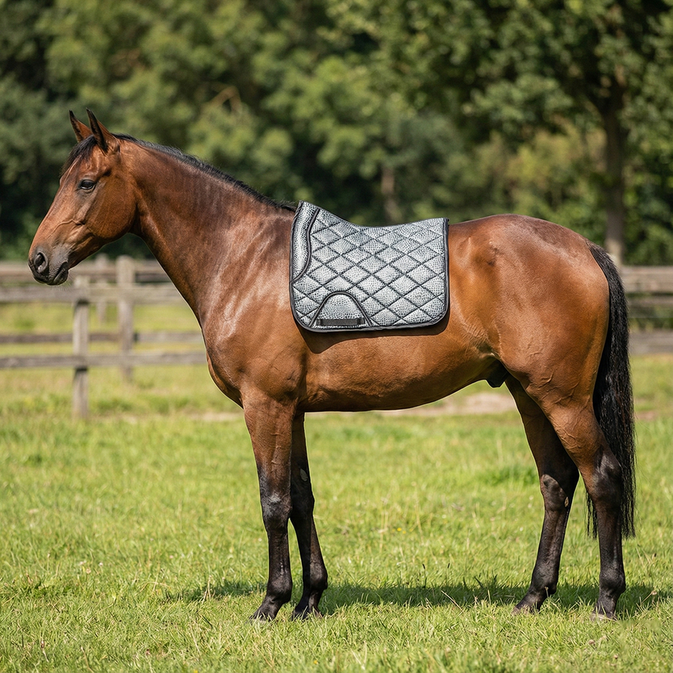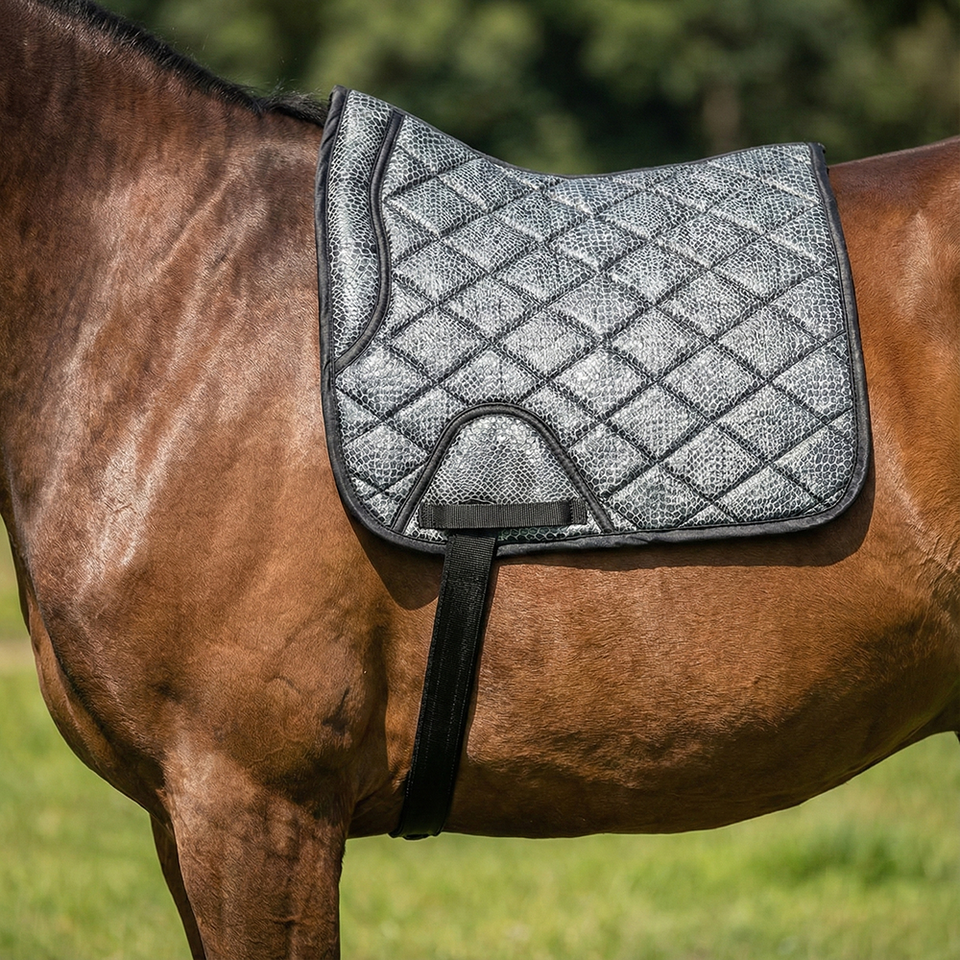 แผ่นรองอานม้าทรงสูงแบบควิลท์ลายเพชร สีเทา ลายหนังจระเข้ ขอบสีดำ ซับในตาข่าย ผ้าฝ้ายและโฟม สำหรับฝึกซ้อม