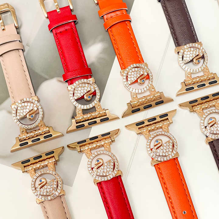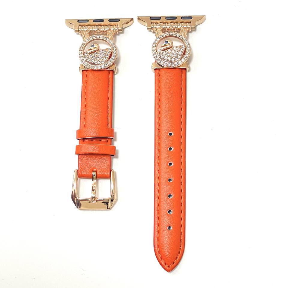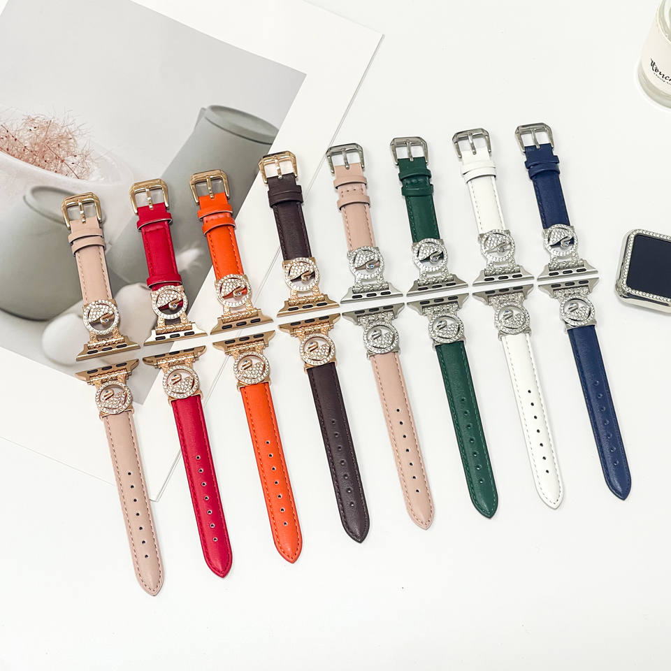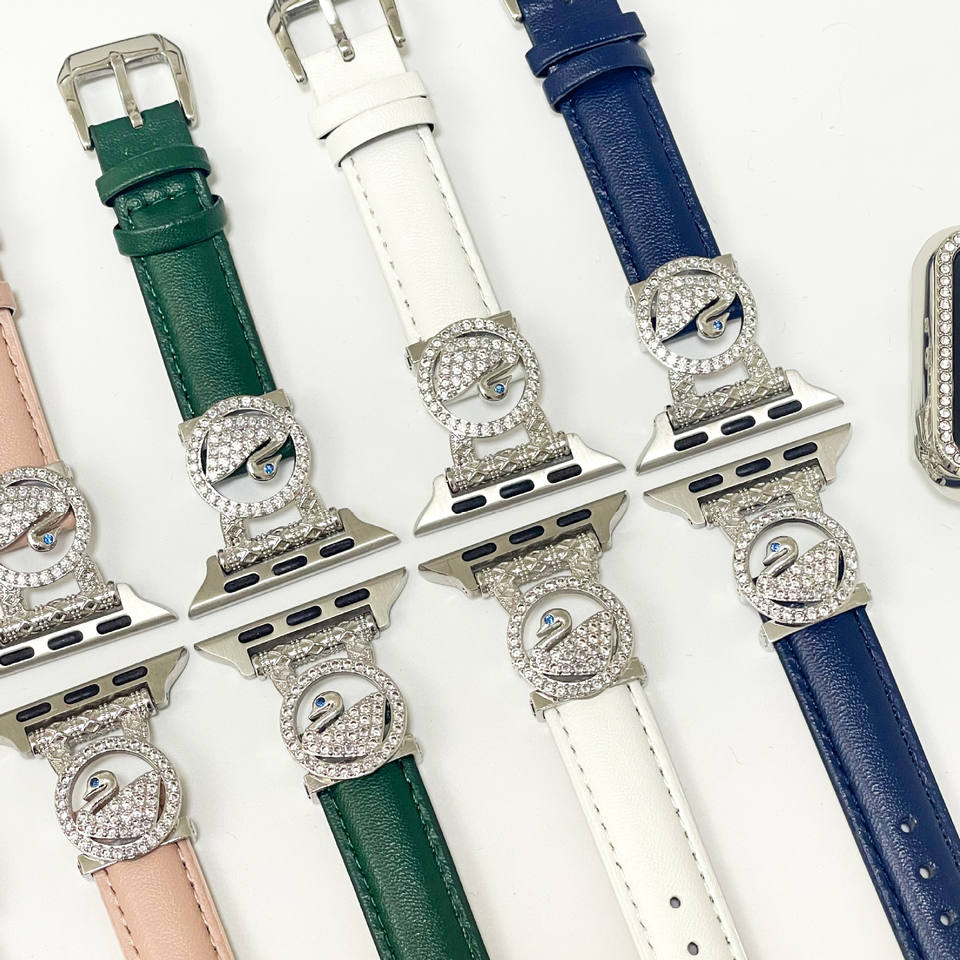 ชุดสายนาฬิกาประดับเพชรรูปหงส์สำหรับผู้หญิงสายหนังแท้สำหรับแอปเปิลวอทช์ขนาด40/42/44/49มม. สายนาฬิกาแฟชั่นแบบบางสำหรับผู้หญิง
