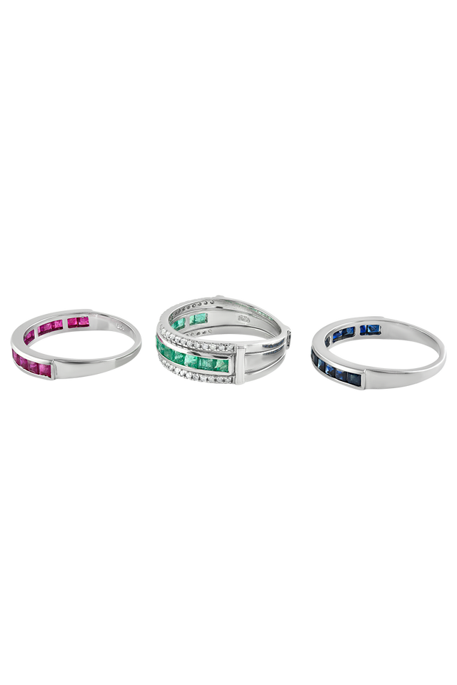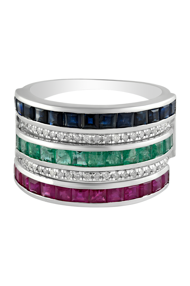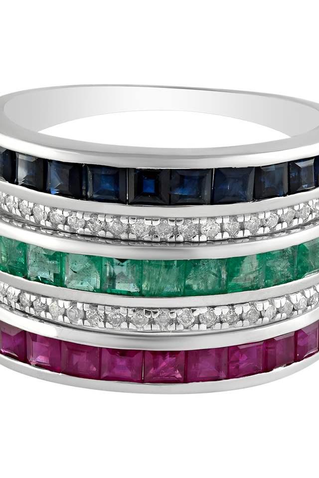 Diamond and Ruby Blue Sapphire Emerald Ring in 92.5 Sterling Silver KLSR-10777