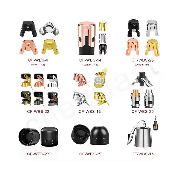 จุกปิดขวดแชมเปญแบบใช้ซ้ำได้หลากหลายชนิด ทำจากไม้ก๊อกและสแตนเลส สำหรับขวดไวน์และขวดแชมเปญแบบมีฟอง