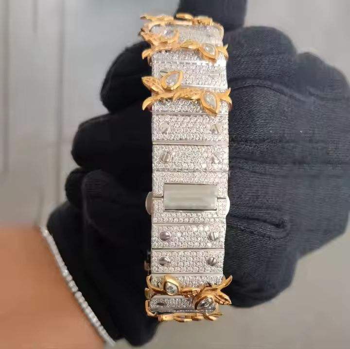 นาฬิกากลไกหน้าปัดสี่เหลี่ยมสีขาวทองสุดหรูของผู้ชายพร้อมแล็บกระจกคริสตัลปลูกเพชร41มม. สไตล์ฮิปฮอปรุ่นลิมิเต็ดอิดิชั่น