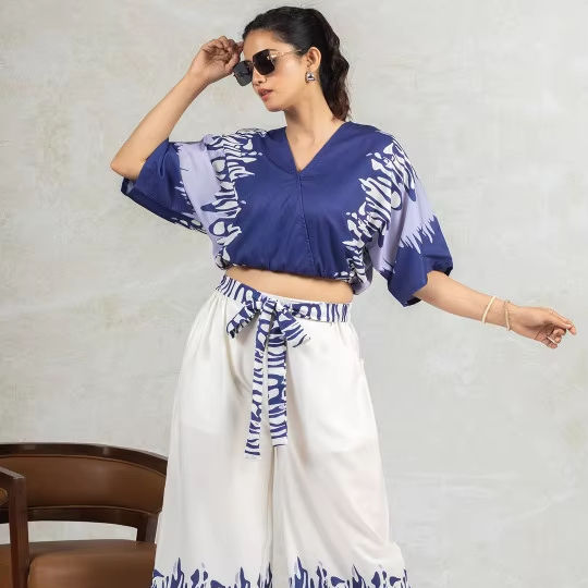 ชุดเซ็ตสองชิ้นลายพิมพ์ดิจิทัลแบบนามธรรม ทำมือ ใส่ได้ทุกวัน ปรับแต่งได้ ผลิตจากโพลีเอสเตอร์ คอวี แต่งลูกไม้ ระบายอากาศได้ดี เป็นมิตรต่อสิ่งแวดล้อม