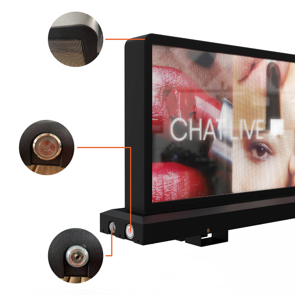 เครื่องเล่นโฆษณาเชิงพาณิชย์แบบดิจิทัลบอร์ดติดหลังคารถ IP65กลางแจ้งกันน้ำหน้าจอแสดงผล LED