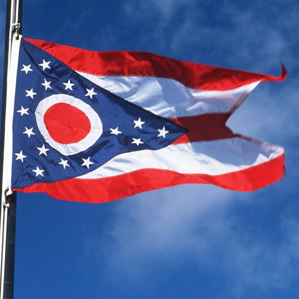 การพิมพ์ดิจิทัลธงรัฐโอไฮโอ ขนาด 3x5 ฟุต สำหรับใช้งานกลางแจ้ง ปักอย่างดี ทนทาน พร้อมแถบเย็บอย่างแข็งแรง และห่วงทองเหลือง 2 จุด