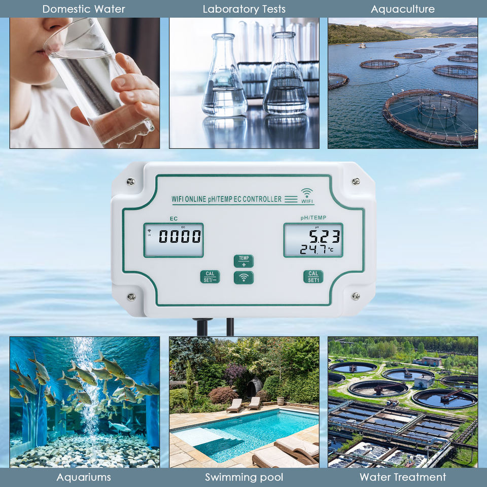 เครื่องควบคุมอุณหภูมิเครื่องวัดค่า PH EC แบบดิจิตอล, เครื่องทดสอบและจ่ายยาแบบออนไลน์ Tuya แอปสระว่ายน้ำบ่อปลา