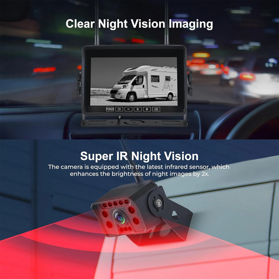 กล้องมองหลังไร้สายดิจิตอล จอภาพติดรถยนต์ 7 นิ้ว แบบแบ่งหน้าจอ บันทึกภาพ DVR 4 ช่อง พร้อมระบบตรวจจับ AI และ BSD สำหรับรถบ้าน รถพ่วง รถคาราวาน