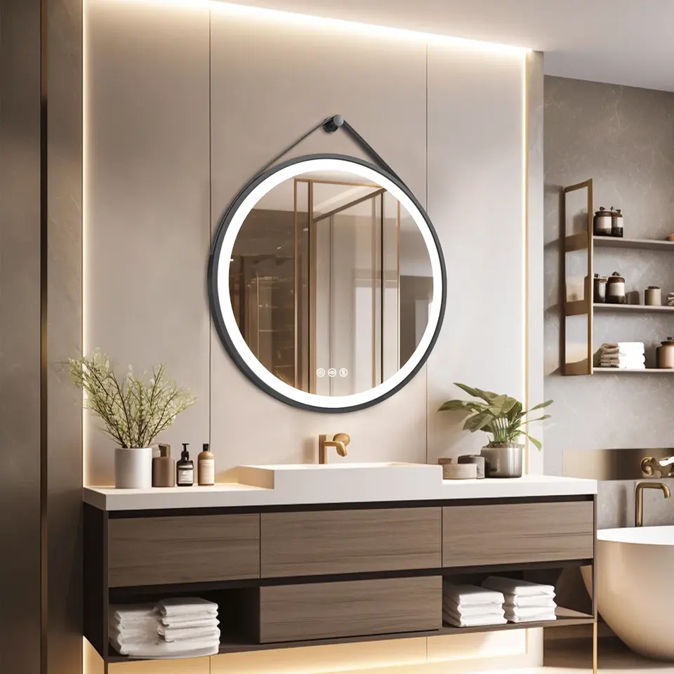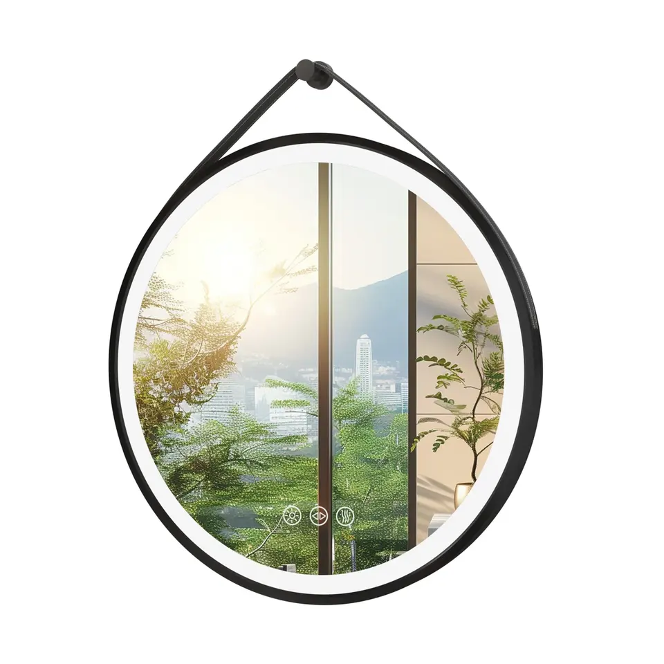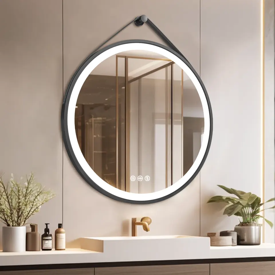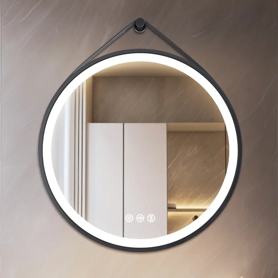 กระจกโต๊ะเครื่องแป้ง LED หรี่แสงได้ติดผนังพร้อมสายหนังปรับอุณหภูมิได้3สี & คุณสมบัติกันฝ้า