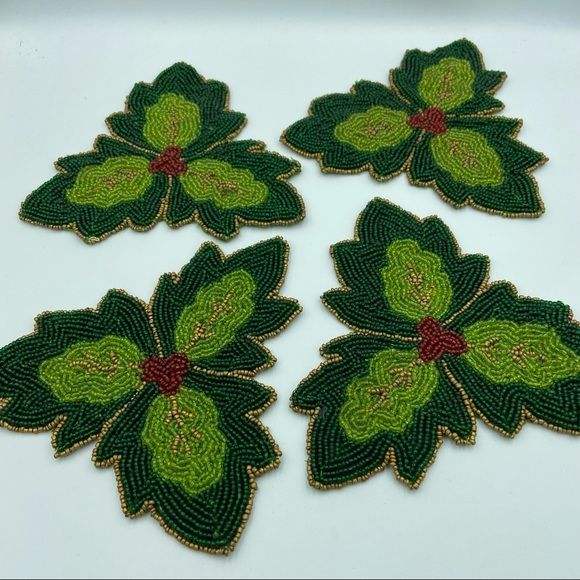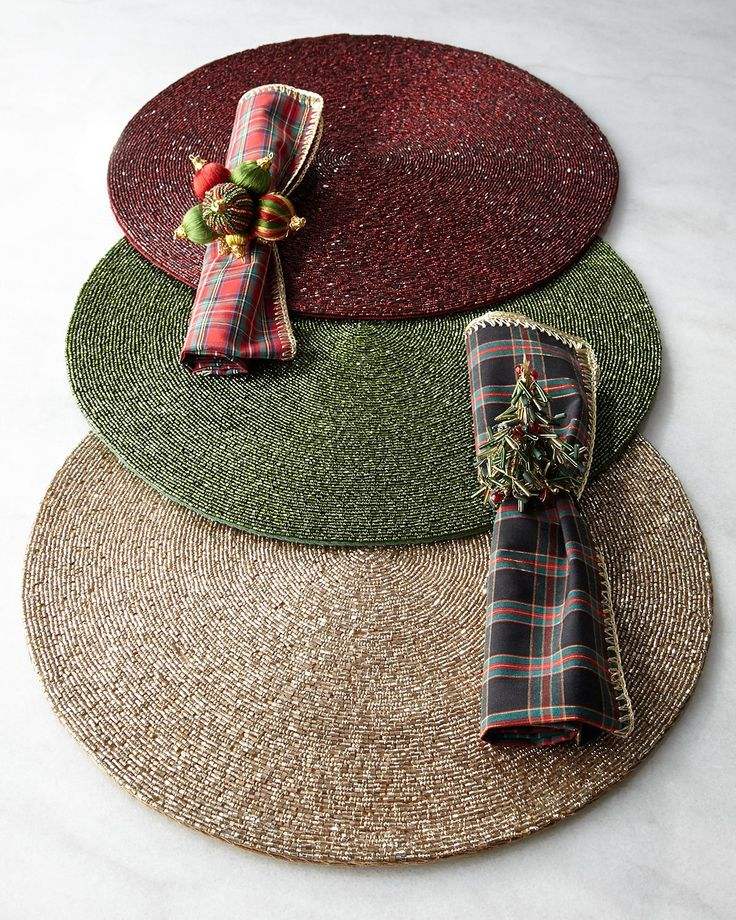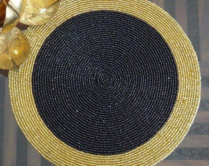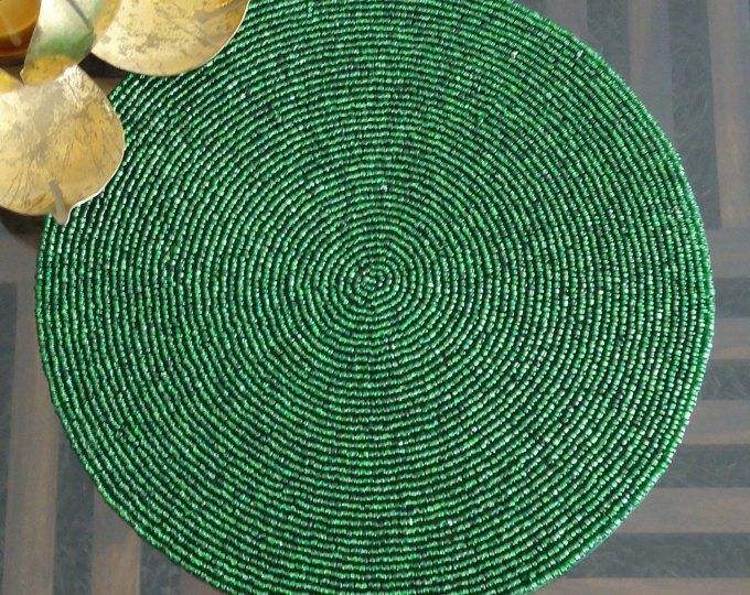 แผ่นรองจานสำหรับรับประทานอาหาร แผ่นรองกันความร้อนในครัว แผ่นรองโต๊ะกลมประดับลูกปัดแก้ว สีแดงเขียวทอง ลายวิบวับ งานแฮนด์เมด