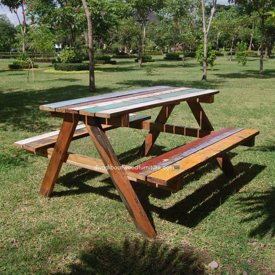 โต๊ะปิกนิกพร้อมเก้าอี้ ทำด้วยไม้เรือรีไซเคิล สีธรรมชาติ สำหรับสวนกลางแจ้ง บ้านพักอาศัย เฟอร์นิเจอร์แบบถอดประกอบได้