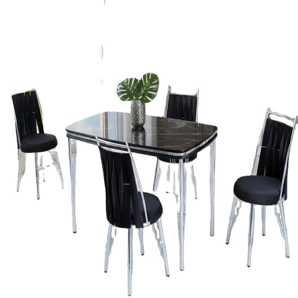ชุดโต๊ะอาหารพร้อมเก้าอี้ 6 ตัว ท็อปกระจกนิรภัยแบบขยายได้ ขาโลหะ โครงสร้างแผ่นไม้อัด เป็นมิตรกับสิ่งแวดล้อมและทนทาน