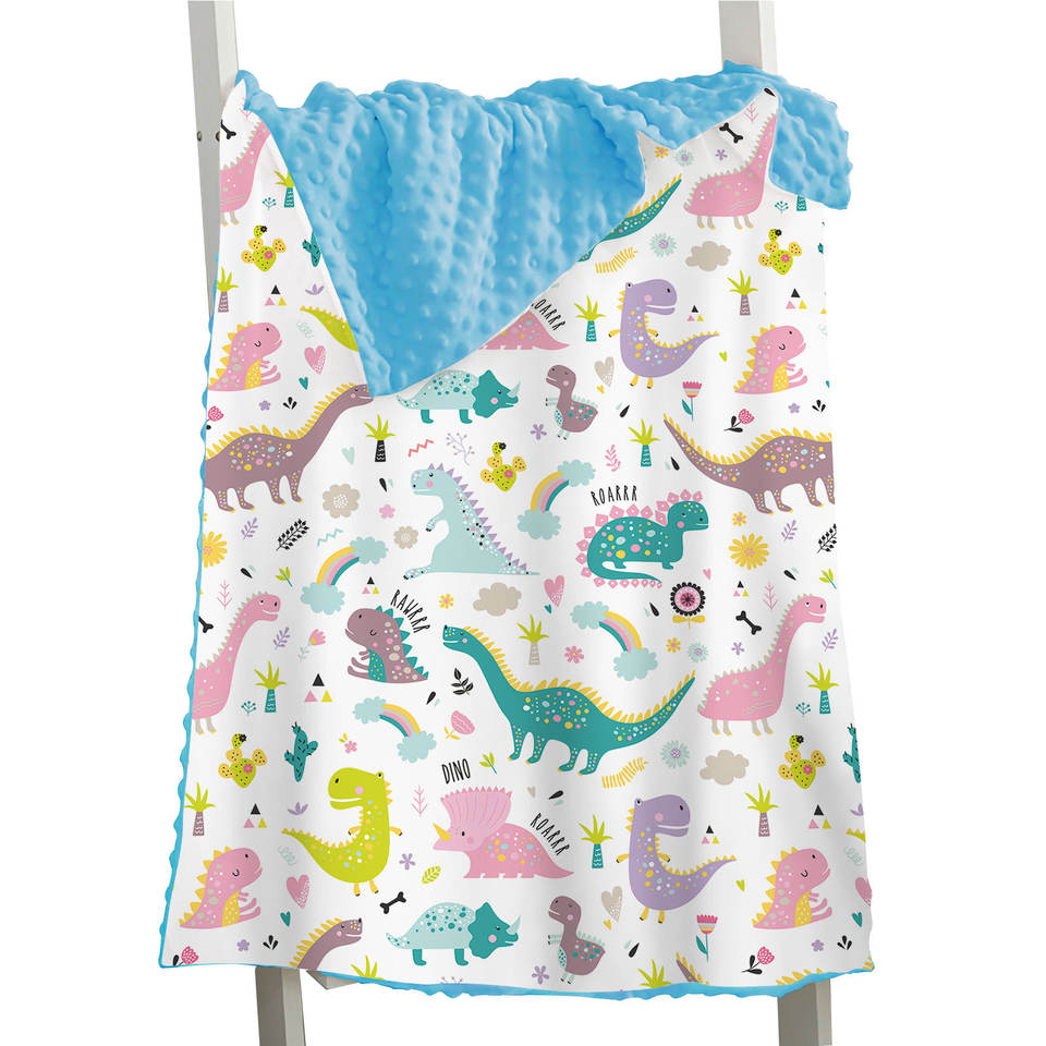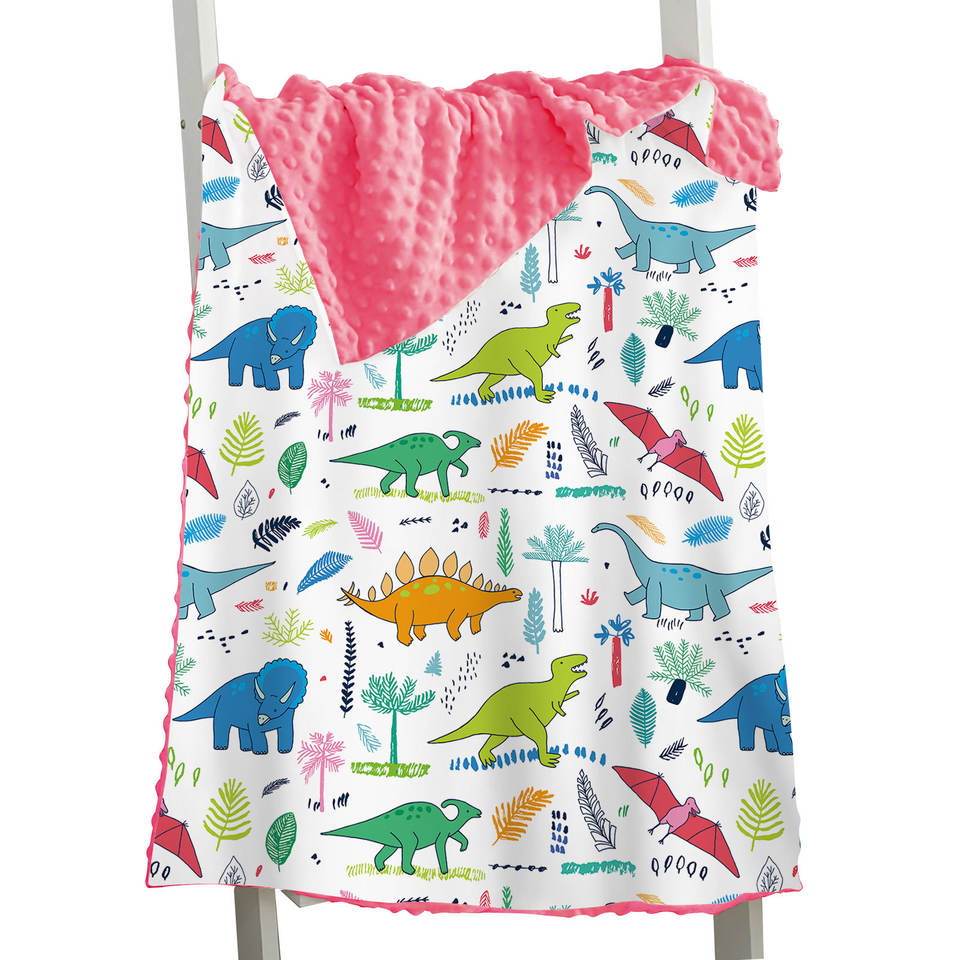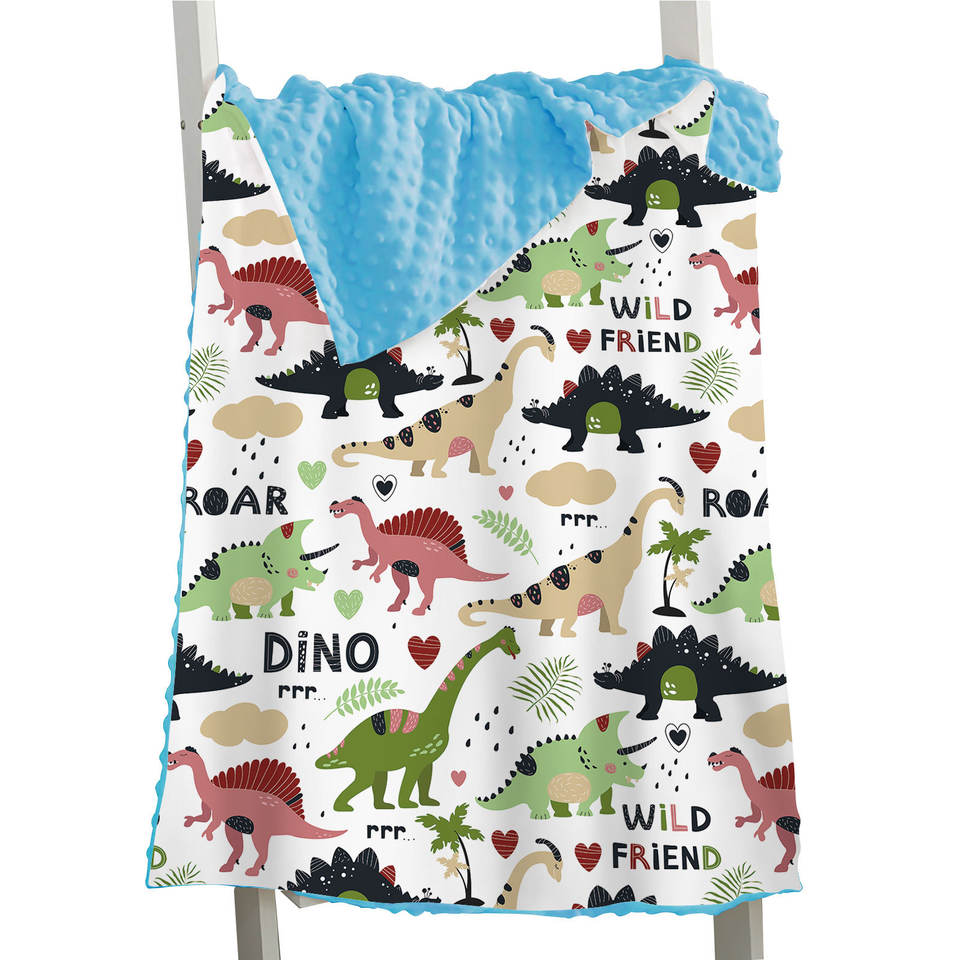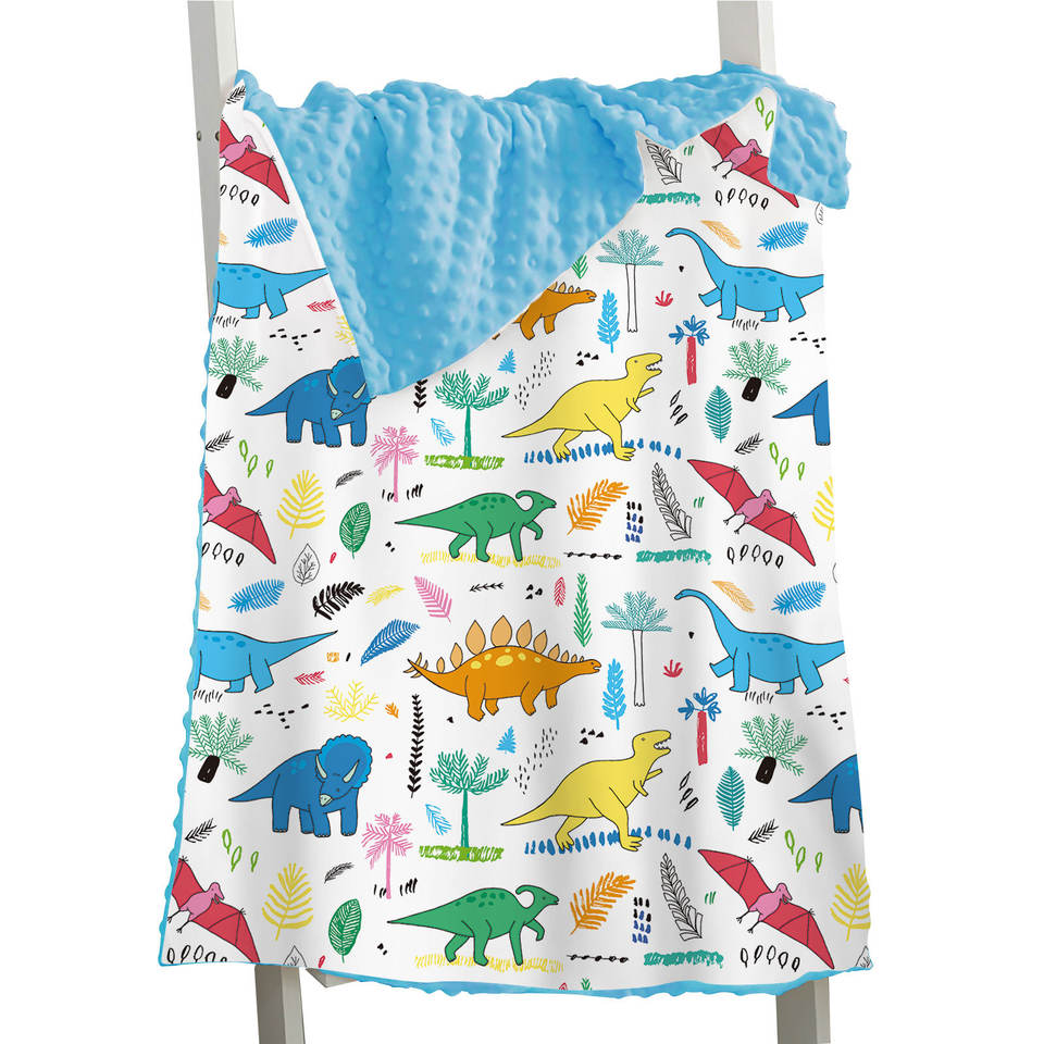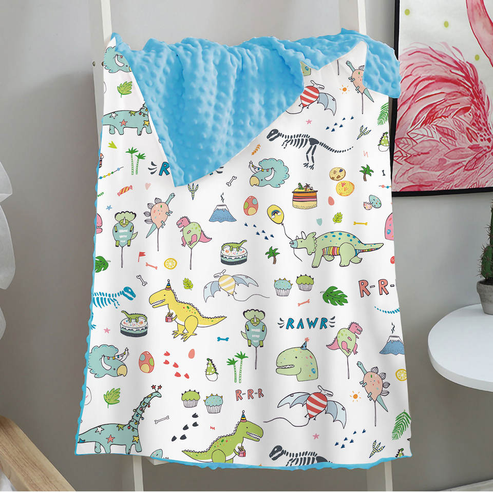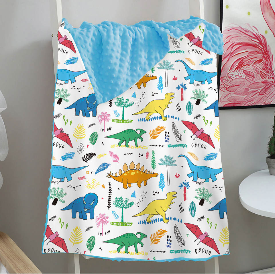 ผ้าคลุมบีนนี่ขนแกะสองชั้นพิมพ์ลายไดโนเสาร์ผ้าห่มสีน้ำเงินบีนนี่ผ้าห่มขนแกะสำหรับเด็ก
