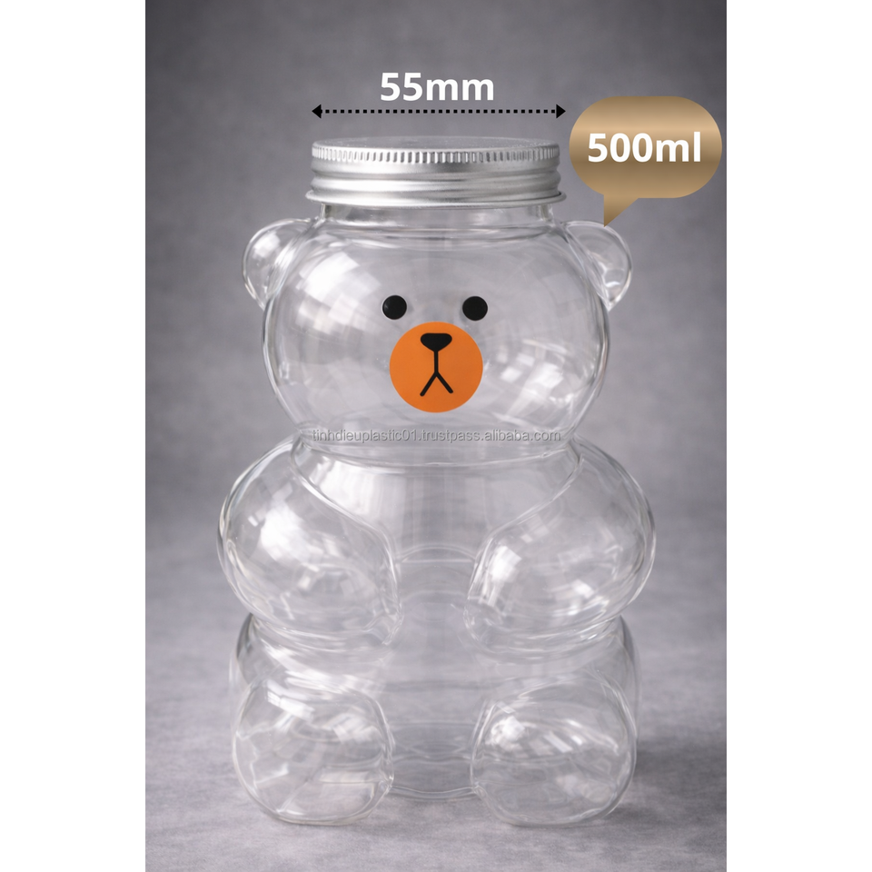 โรงงานผลิตโดยตรง ขวดพลาสติก PET รูปหมีน่ารัก ขนาด 500 มล. พร้อมฝาอลูมิเนียมขนาด 55 มม. สำหรับน้ำผลไม้