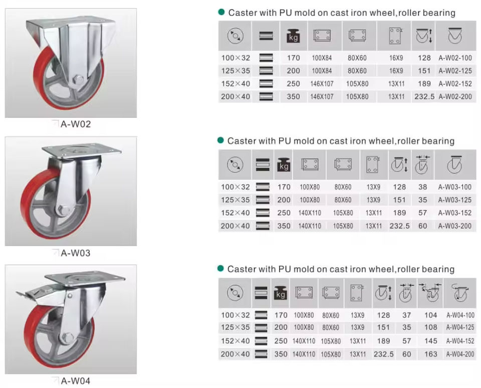 Caster with PU mold on cast iron wheel roller bearModel Number