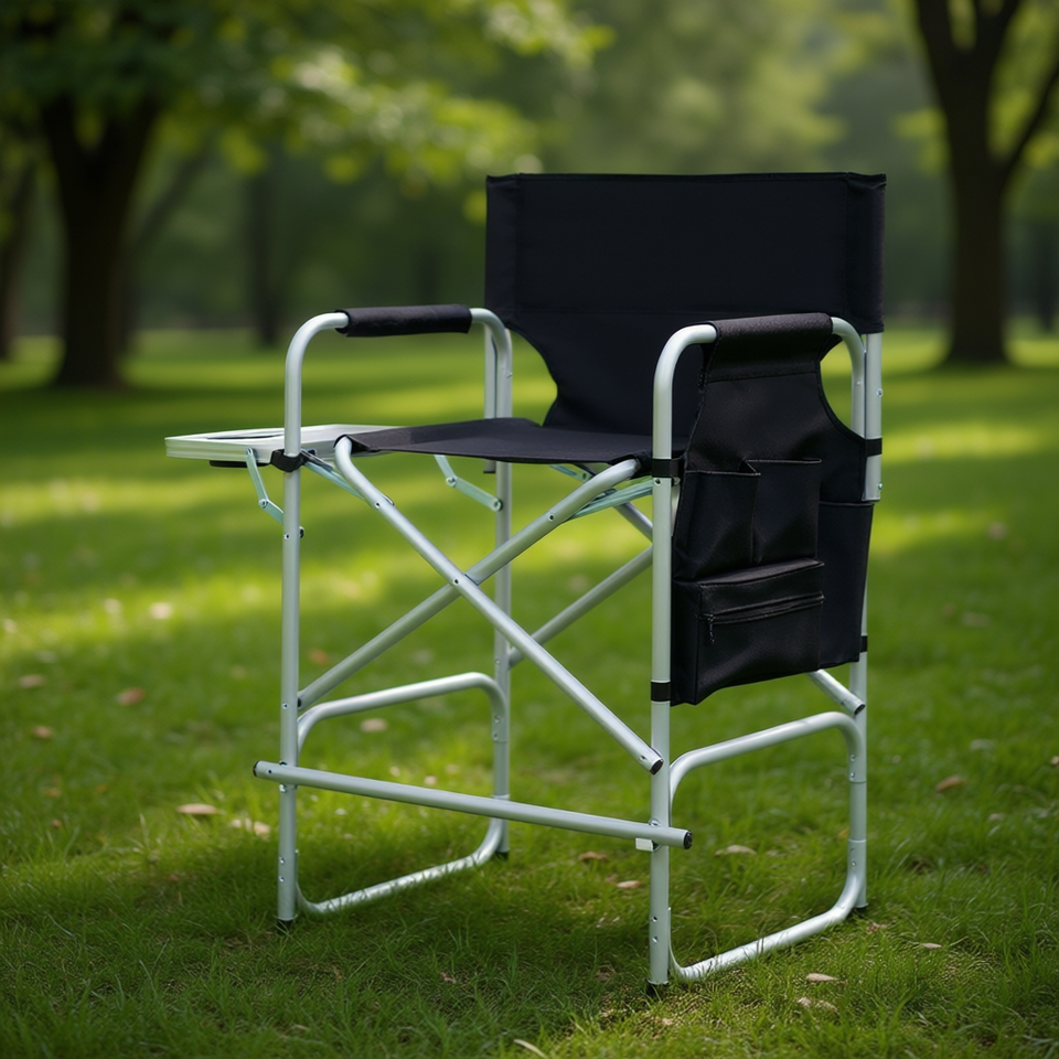 เก้าอี้ผู้บริหาร ผ้าสีดำ ท่อเหล็กสีเงินขาว พับได้ สำหรับสวนกลางแจ้ง พร้อมโต๊ะข้าง