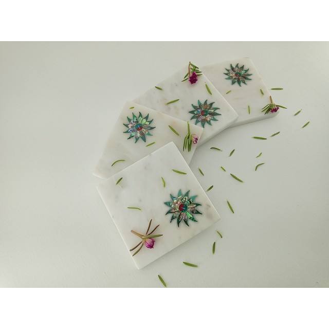 ชุดถาดรองแก้วหินอ่อนแบบสั่งทำลายหรูหราและฝังโลหะเสื่อและแผ่นรองสำหรับเครื่องดื่มส่วนบุคคล