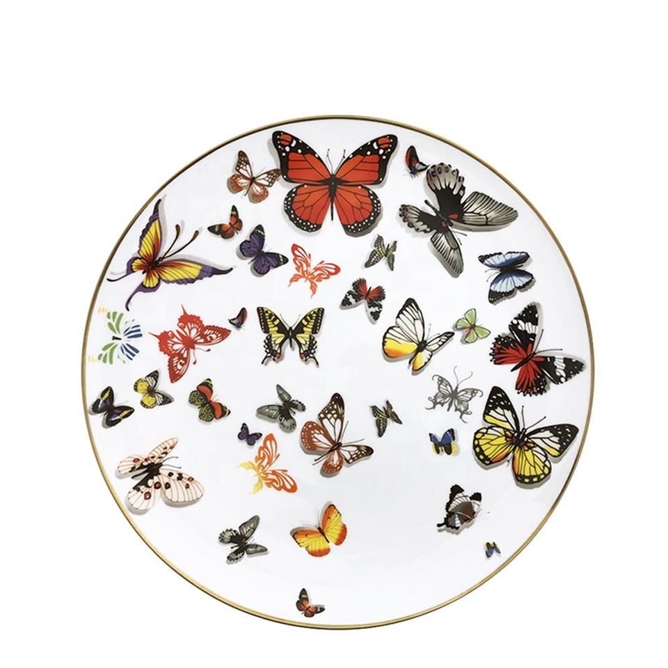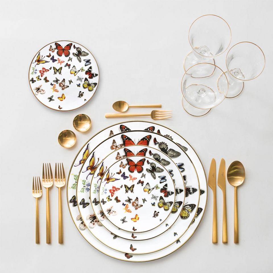 จานและจานลายแบบเซรามิกแฟชั่นยุโรปหรูหราสวนผีเสื้อพร้อมขอบทองจานอาหารค่ำสำหรับงานแต่งงาน