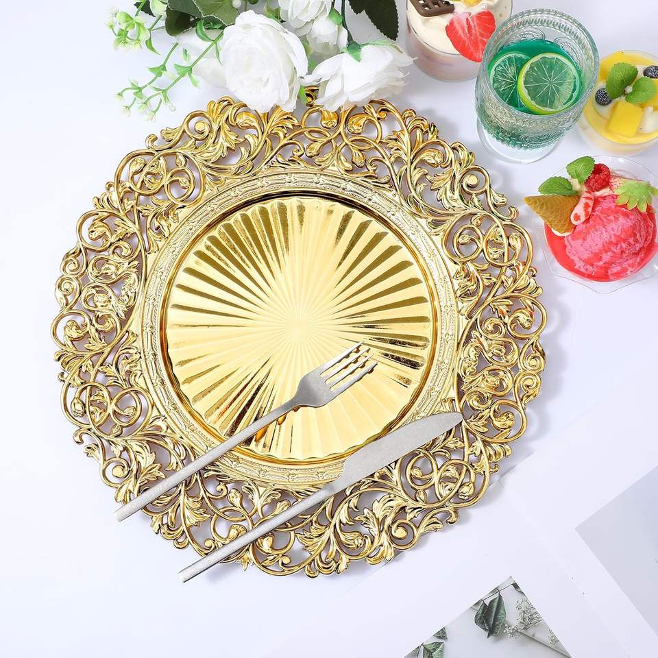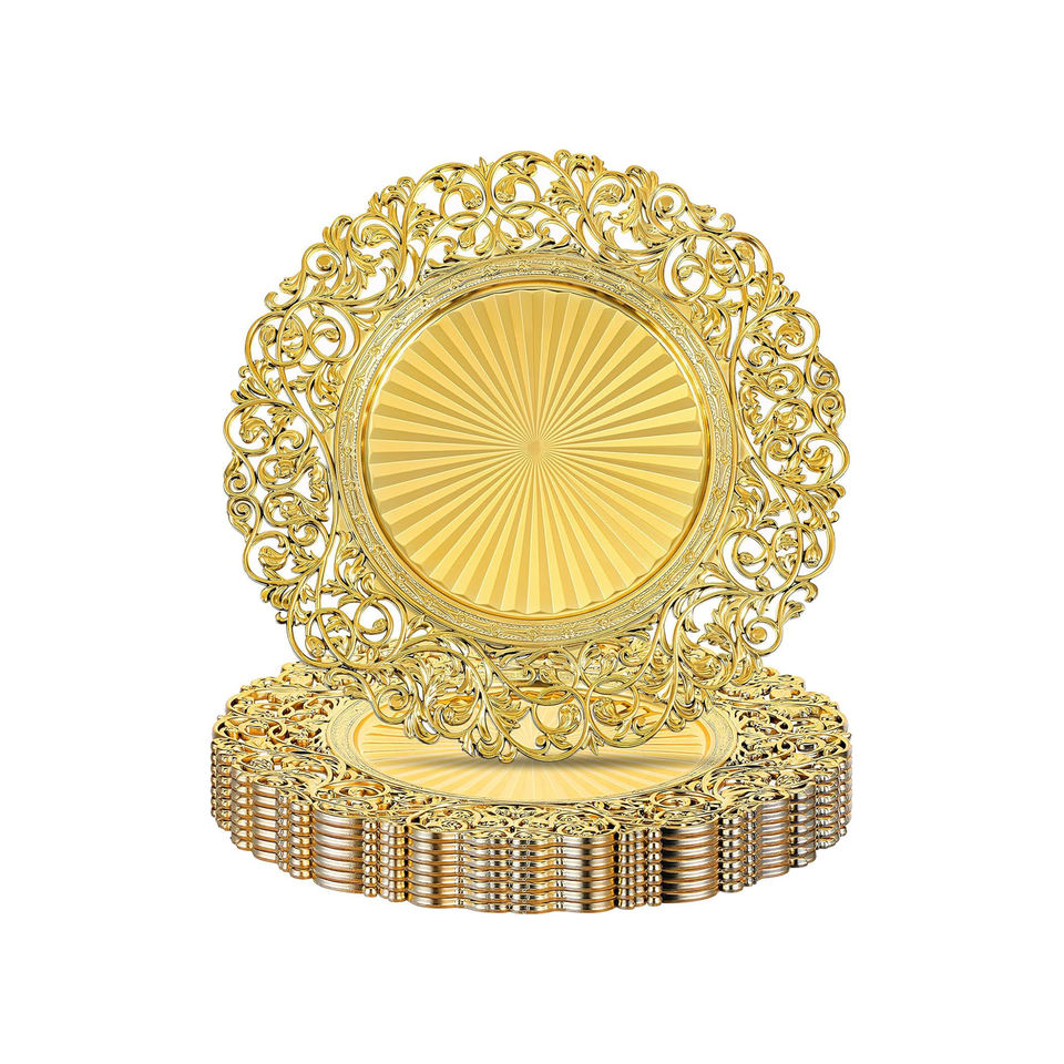 จานและถาดรองขนาด 13 นิ้ว 15 นิ้ว จานรองสำหรับงานแต่งงาน จานรองพลาสติกสีทองสำหรับร้านอาหาร