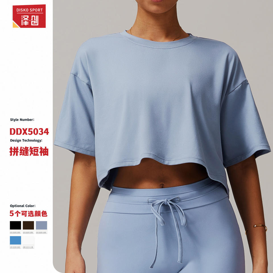 ดิสโก้ สปอร์ตเสื้อครอปผู้หญิงแขนสั้นคอกลมสีทึบชุดออกกำลังกายโยคะ DDX5034