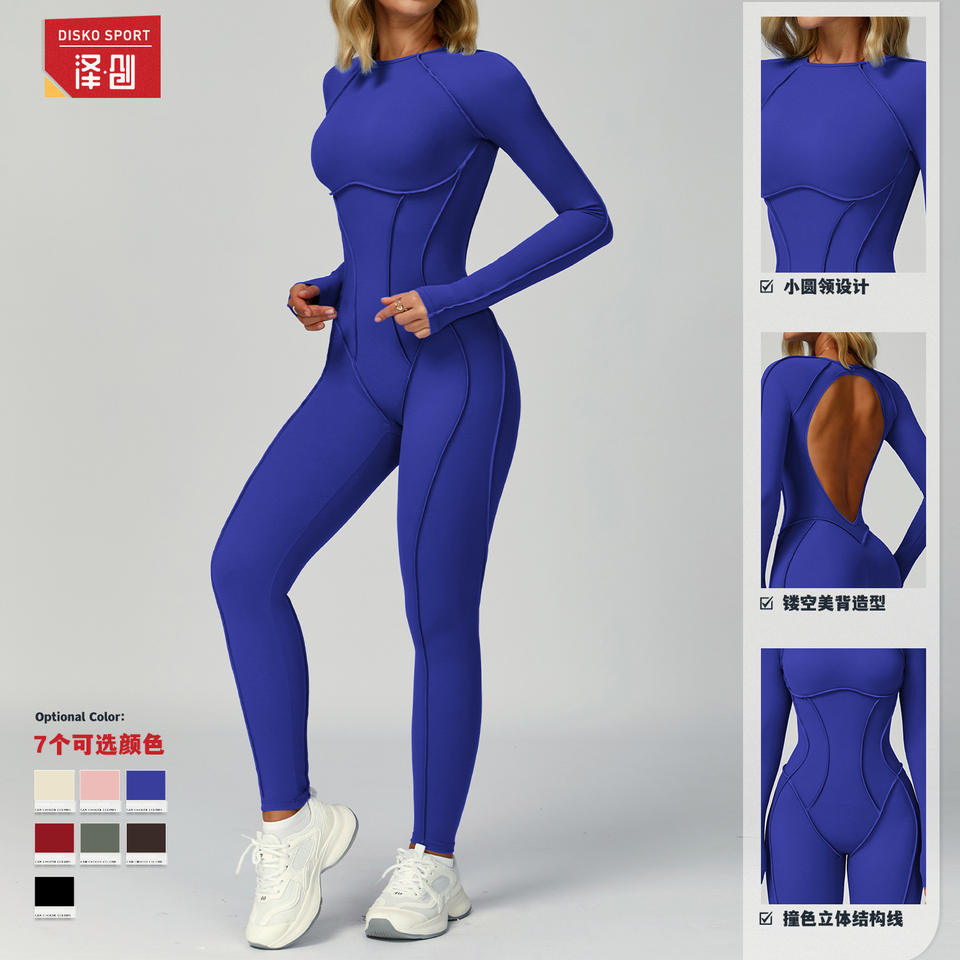 ดิสโก้ สปอร์ตชุดบอดี้สูทโยคะสำหรับผู้หญิงคอวีลึกแขนยาวกระชับพอดีหลังเว้าชุดกีฬา ELT9319