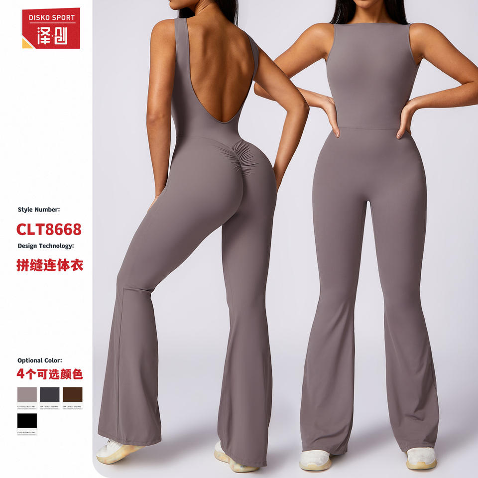 ดิสโก้ สปอร์ตชุดบอดี้สูทโยคะสำหรับผู้หญิง คอเหลี่ยม ขาบาน ชุดออกกำลังกายแบบยืดได้ สีเทา CLT8668